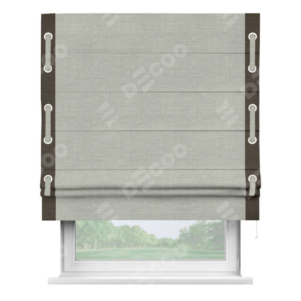 Римская штора производителя «Cortin», используется для проёма, пошита из ткани лён серый, артикул 7440. Отделка шторы кантом «Стрим Дуо» на кантах расположены люверсы с пояском, ткань для канта используется из льна разной расцветки на выбор. Ткань для пояска обычно используется из основной ткани шторы, а так же можно сделать из любой расцветки по желанию. Имеет универсальный механизм и подходит для монтажа: на потолок, на стену и в нишу.