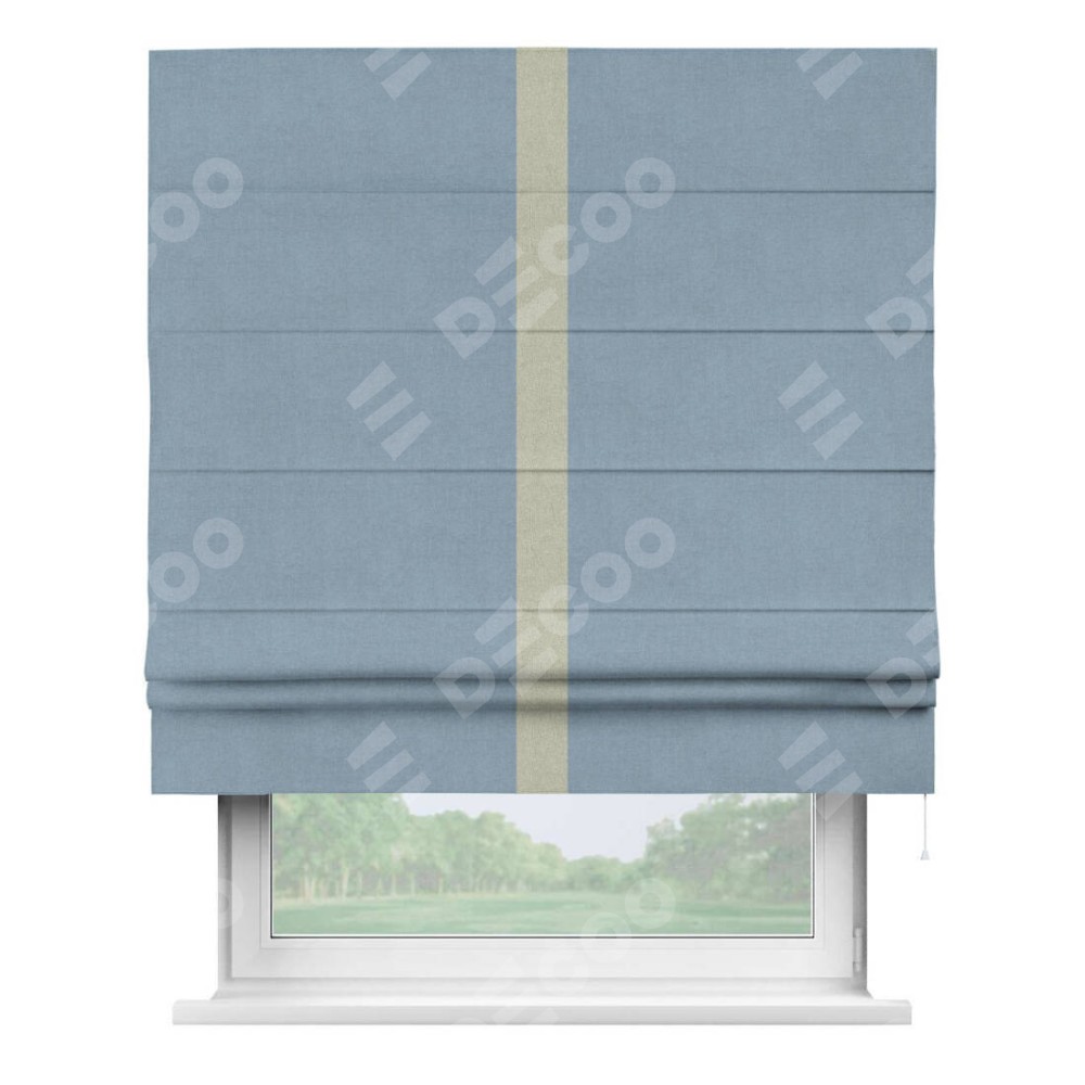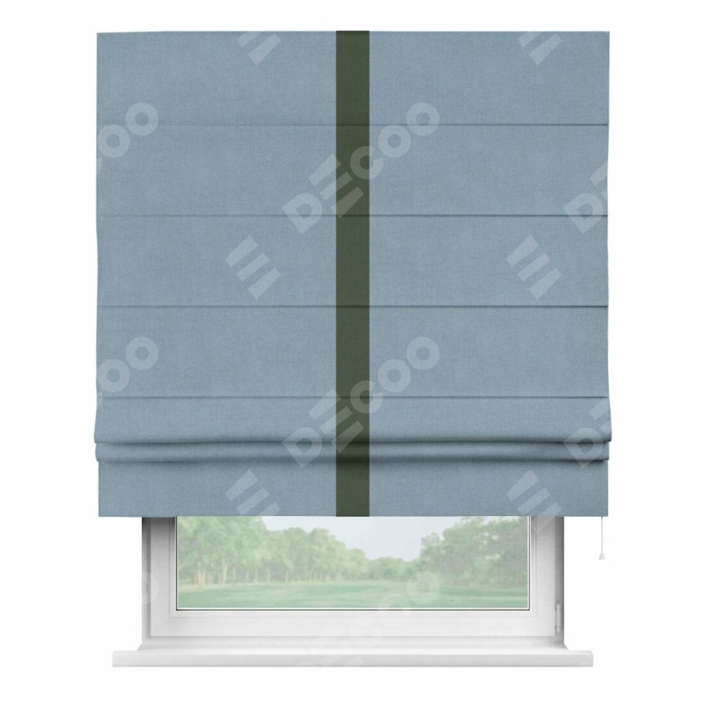 Римская штора производителя «Cortin», используется для проёма, пошита из ткани лён блэкаут голубой, артикул 69574. Отделка шторы кантом «Хайвэй», ткань для канта используется из льна разной расцветки на выбор. Имеет универсальный механизм и подходит для монтажа: на потолок, на стену и в нишу.