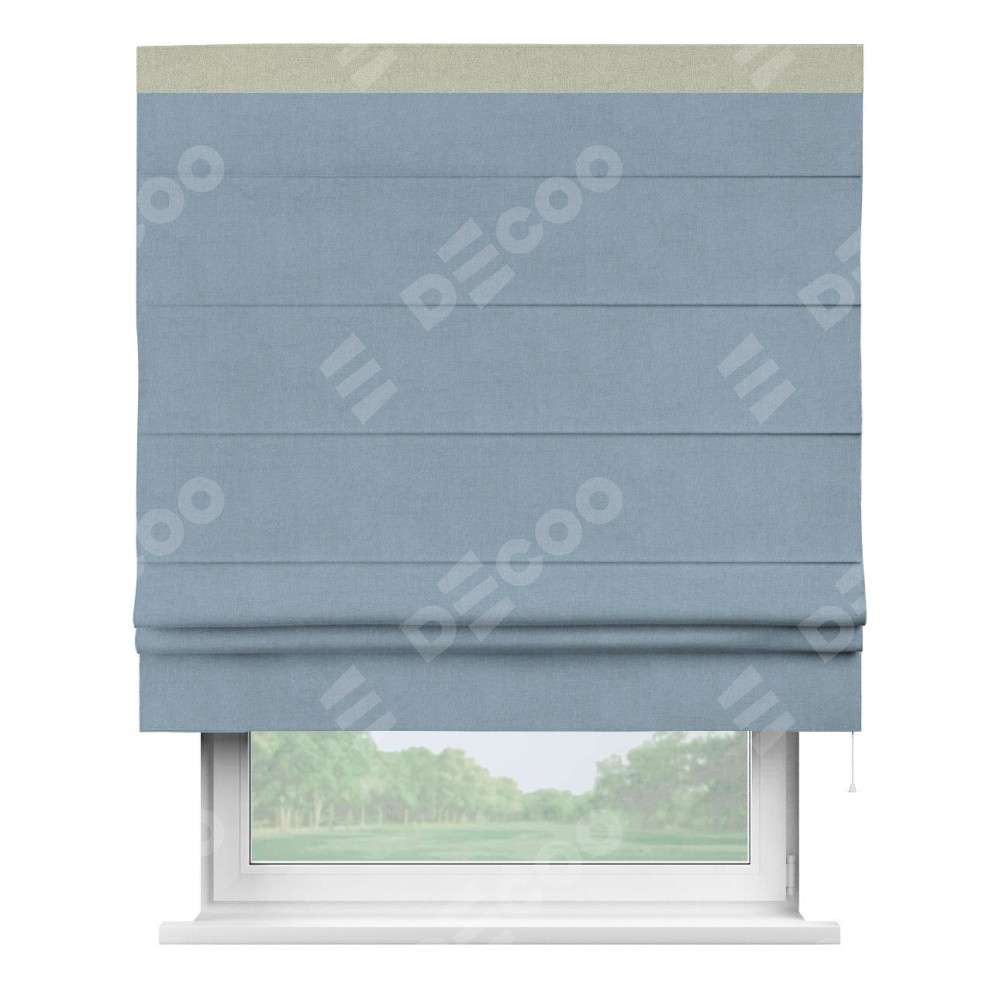 Римская штора производителя «Cortin», используется для проёма, пошита из ткани лён блэкаут голубой, артикул 69574. Отделка шторы кантом «Кинг», ткань для канта используется из льна разной расцветки на выбор. Имеет универсальный механизм и подходит для монтажа: на потолок, на стену и в нишу.