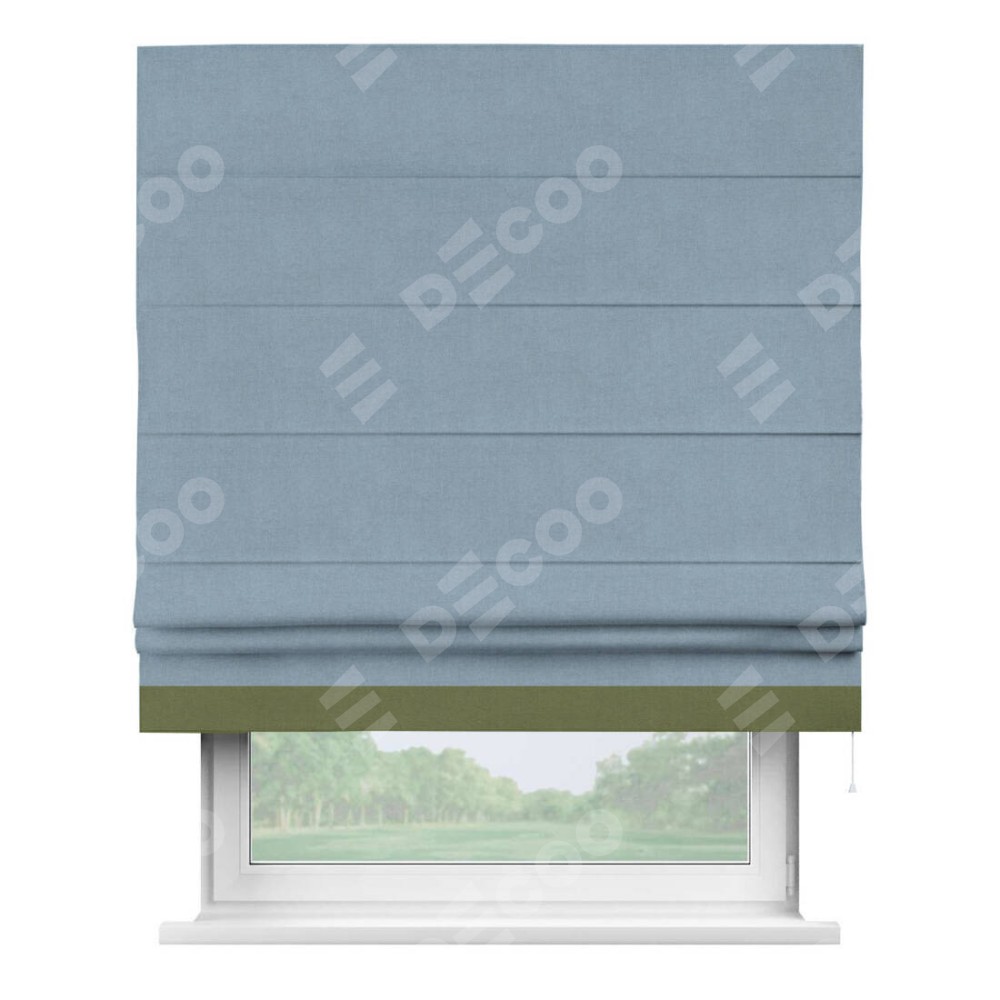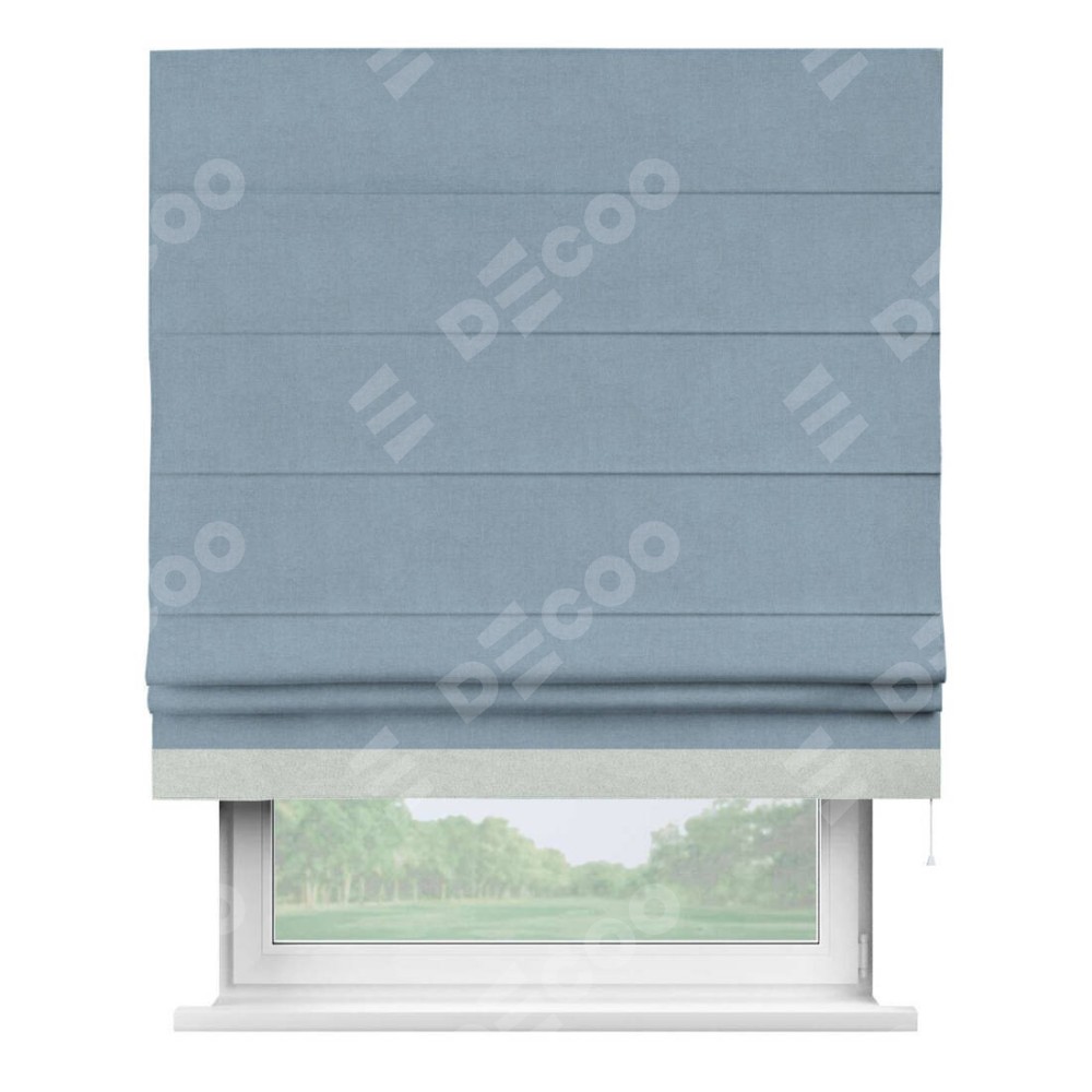 Римская штора производителя «Cortin», используется для проёма, пошита из ткани лён блэкаут голубой, артикул 69574. Отделка шторы кантом «Джестер», ткань для канта используется из льна разной расцветки на выбор. Имеет универсальный механизм и подходит для монтажа: на потолок, на стену и в нишу.