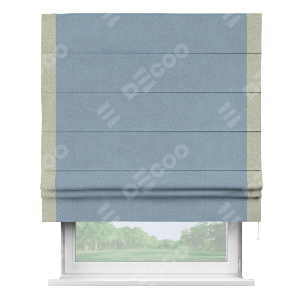 Римская штора производителя «Cortin», используется для проёма, пошита из ткани лён блэкаут голубой, артикул 69574. Отделка шторы кантом «Стрим Дуо», ткань для канта используется из льна разной расцветки на выбор. Имеет универсальный механизм и подходит для монтажа: на потолок, на стену и в нишу.