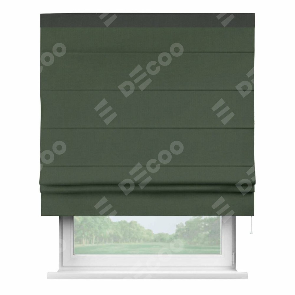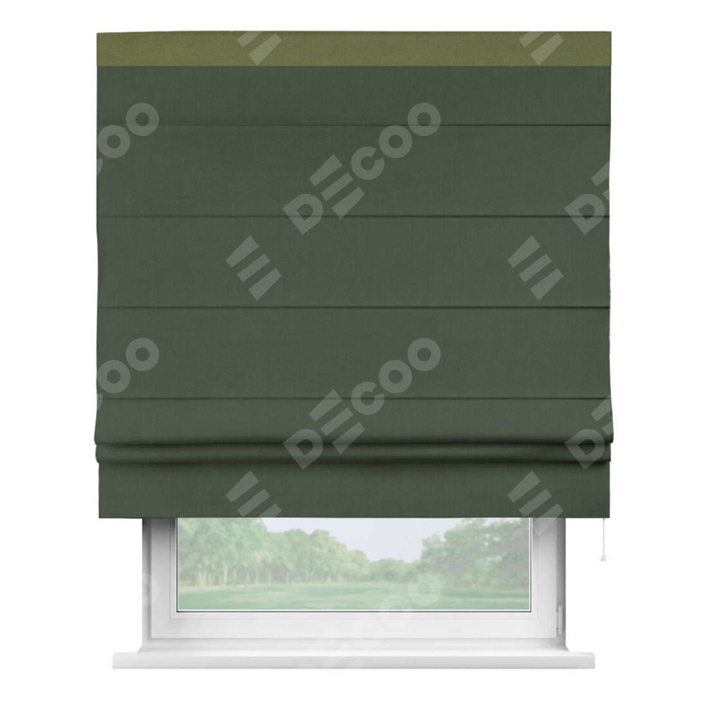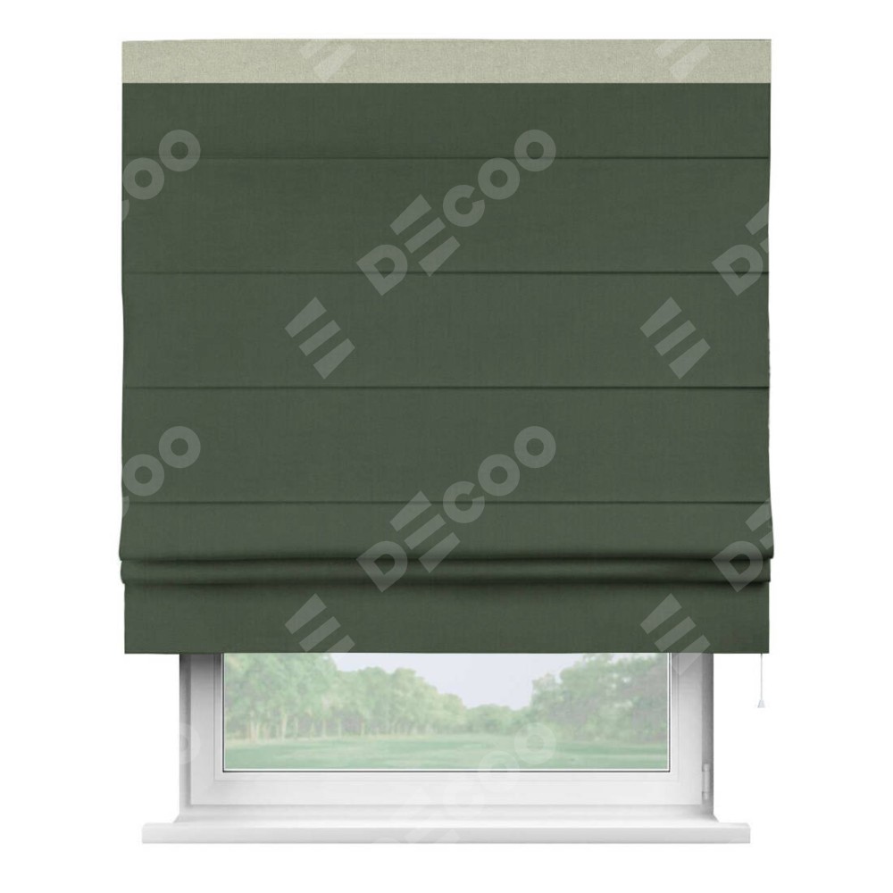 Римская штора производителя «Cortin», используется для проёма, пошита из ткани лён блэкаут зелёный, артикул 69497. Отделка шторы кантом «Кинг», ткань для канта используется из льна разной расцветки на выбор. Имеет универсальный механизм и подходит для монтажа: на потолок, на стену и в нишу.
