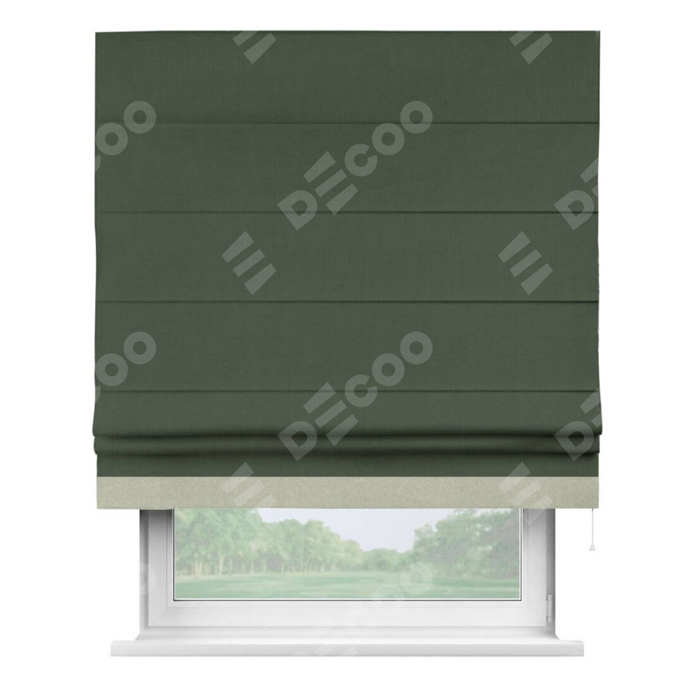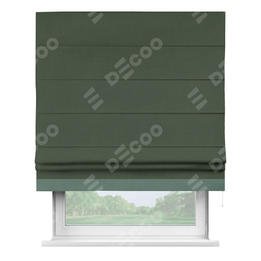 Римская штора производителя «Cortin», используется для проёма, пошита из ткани лён блэкаут зелёный, артикул 69497. Отделка шторы кантом «Джестер», ткань для канта используется из льна разной расцветки на выбор. Имеет универсальный механизм и подходит для монтажа: на потолок, на стену и в нишу.