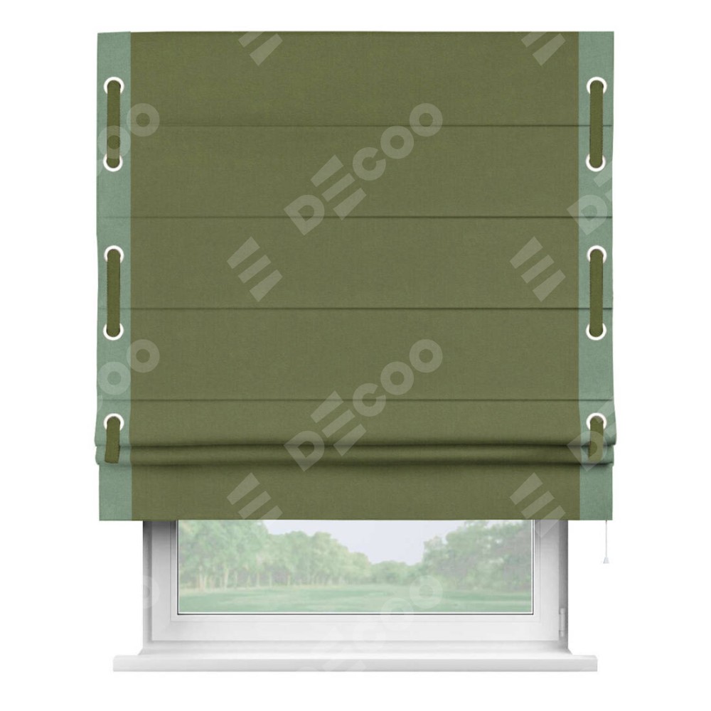 Римская штора производителя «Cortin», используется для проёма, пошита из ткани лён блэкаут оливковый, артикул 69516. Отделка шторы кантом «Стрим Дуо» на кантах расположены люверсы с пояском, ткань для канта используется из льна разной расцветки на выбор. Ткань для пояска обычно используется из основной ткани шторы, а так же можно сделать из любой расцветки по желанию. Имеет универсальный механизм и подходит для монтажа: на потолок, на стену и в нишу.