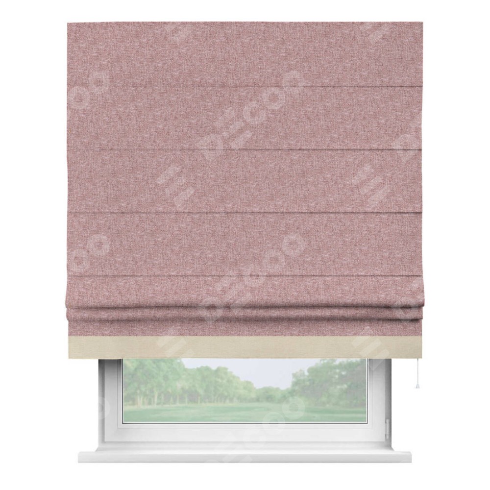 Римская штора производителя «Cortin», используется для проёма, пошита из ткани лён кашемир розовая пудра, артикул 21619. Отделка шторы кантом «Джестер», ткань для канта используется из льна разной расцветки на выбор. Имеет универсальный механизм и подходит для монтажа: на потолок, на стену и в нишу.