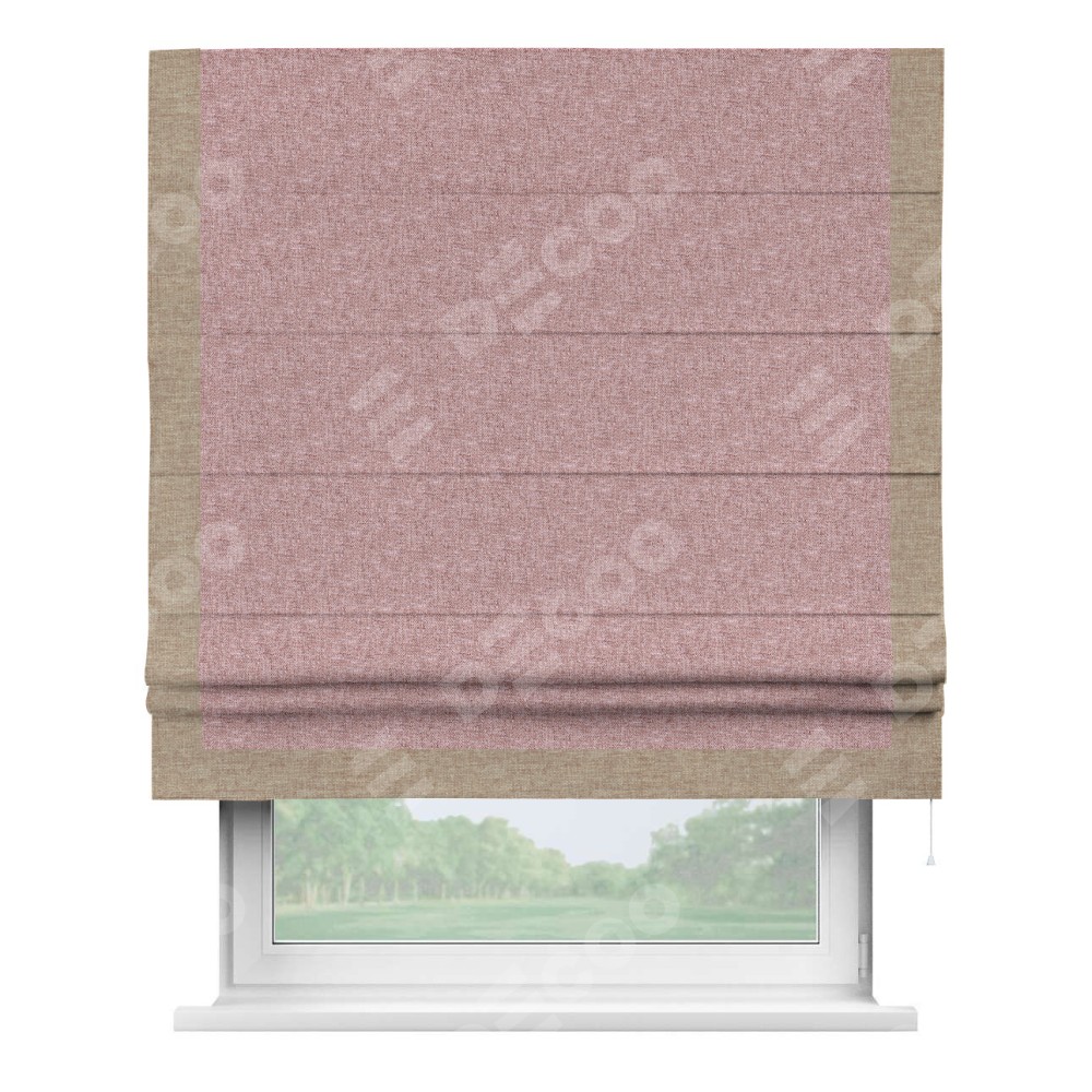 Римская штора производителя «Cortin», используется для проёма, пошита из ткани лён кашемир розовая пудра, артикул 21619. Отделка шторы кантом «Виктория», ткань для канта используется из льна разной расцветки на выбор. Имеет универсальный механизм и подходит для монтажа: на потолок, на стену и в нишу.