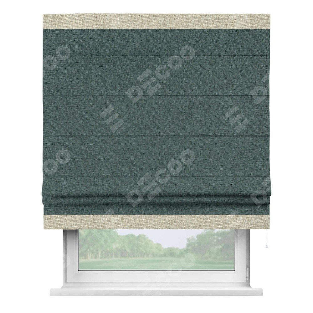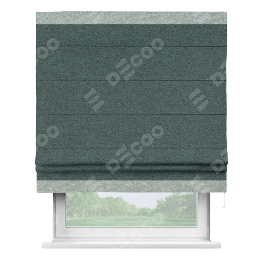 Римская штора производителя «Cortin», используется для проёма, пошита из ткани стиф димаут сине-зелёный, артикул 18194. Отделка шторы кантом «Горизонт», ткань для канта используется из стифа разной расцветки на выбор. Имеет универсальный механизм и подходит для монтажа: на потолок, на стену и в нишу.
