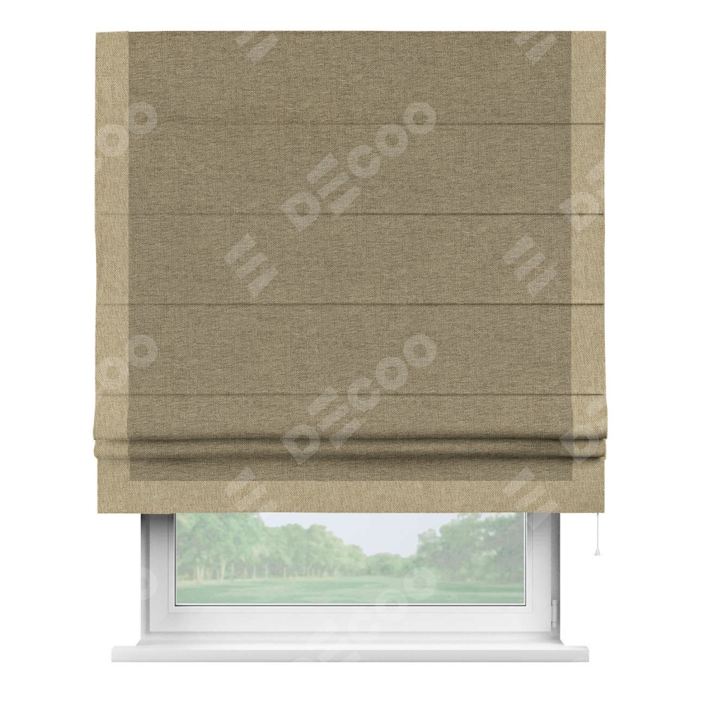 Римская штора производителя «Cortin», используется для проёма, пошита из ткани стиф димаут тёмно-бежевый, артикул 18085. Отделка шторы кантом «Виктория», ткань для канта используется из стифа разной расцветки на выбор. Имеет универсальный механизм и подходит для монтажа: на потолок, на стену и в нишу.
