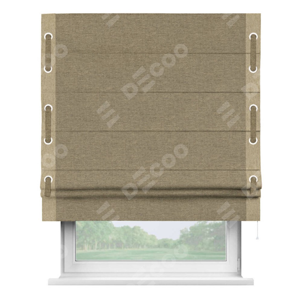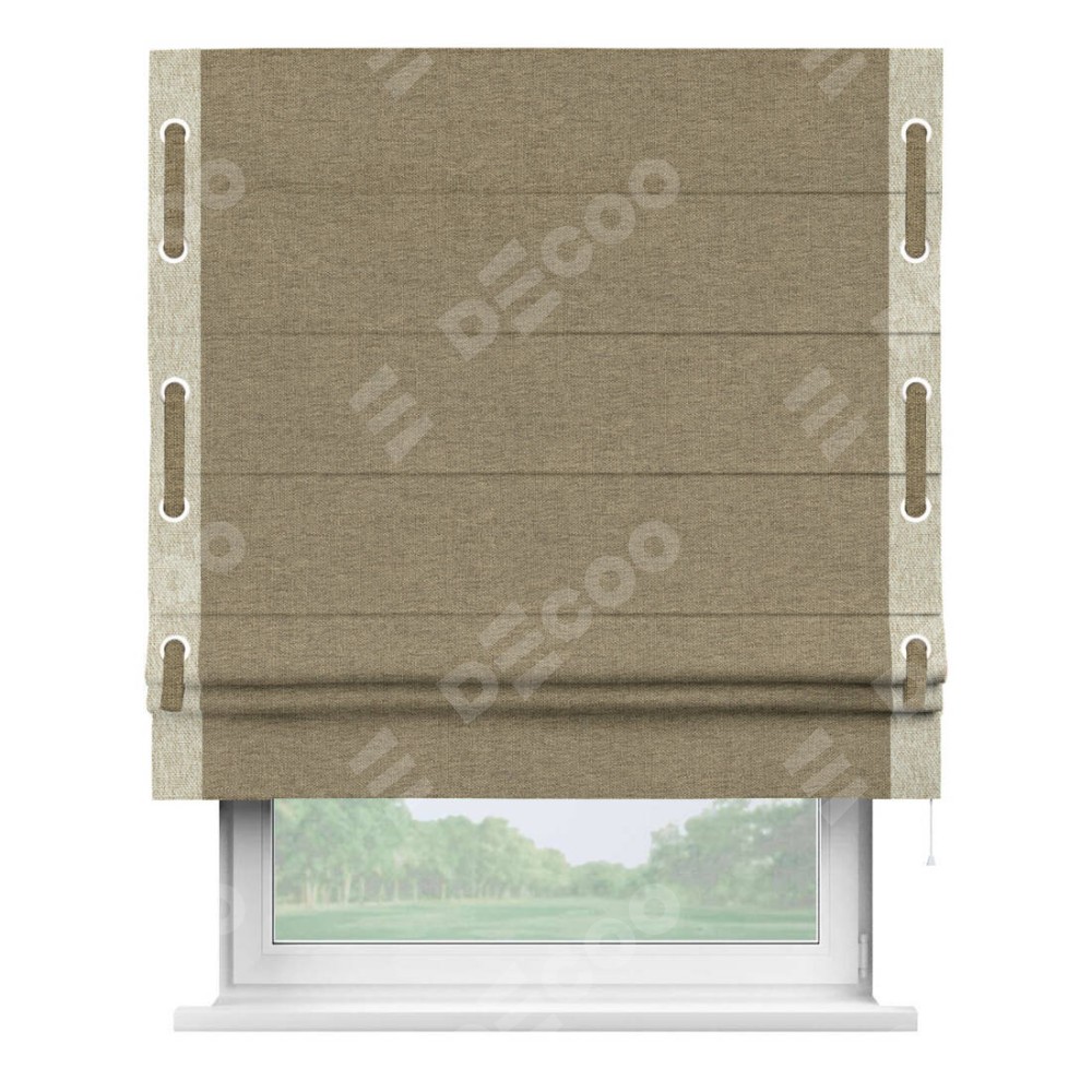 Римская штора производителя «Cortin», используется для проёма, пошита из ткани стиф димаут тёмно-бежевый, артикул 18085. Отделка шторы кантом «Стрим Дуо» на кантах расположены люверсы с пояском, ткань для канта используется из стифа разной расцветки на выбор. Ткань для пояска обычно используется из основной ткани шторы, а так же можно сделать из любой расцветки по желанию. Имеет универсальный механизм и подходит для монтажа: на потолок, на стену и в нишу.