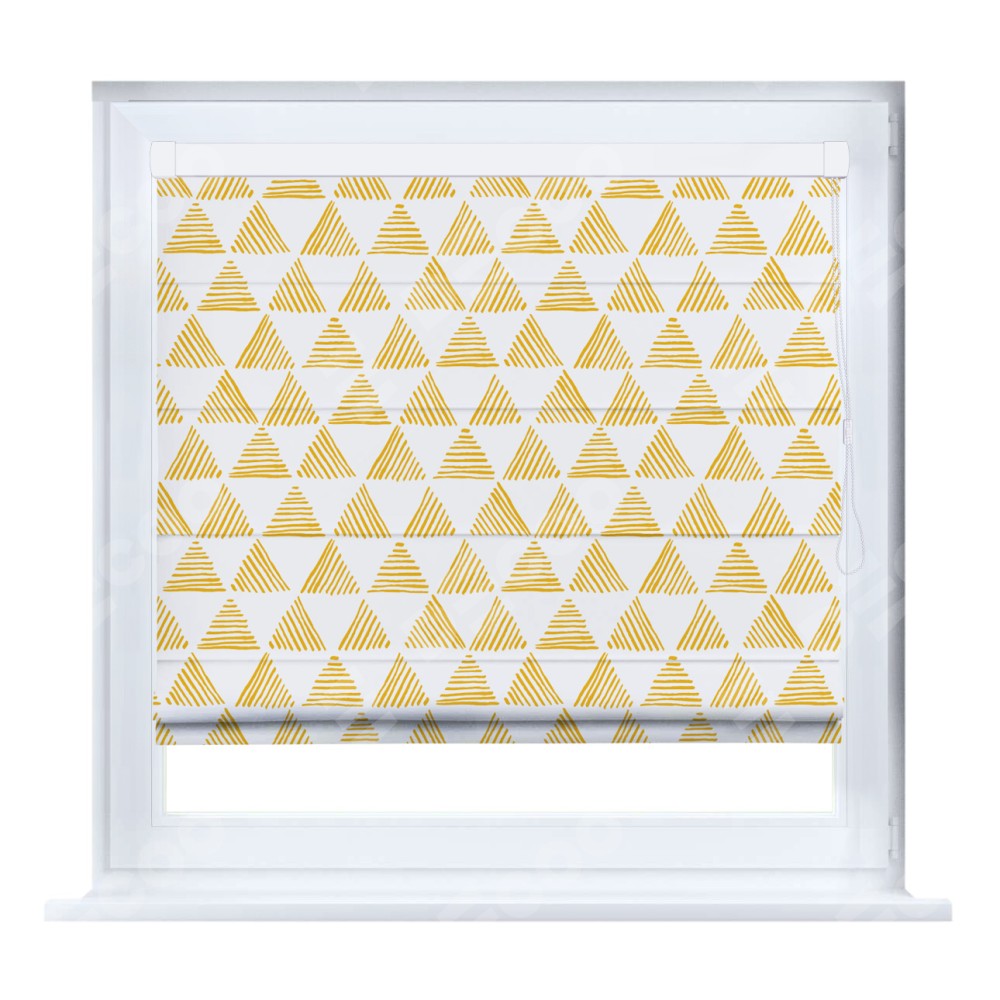 Римская штора производителя «Cortin», устанавливается на створку окна, пошита из ткани блэкаут с нанесением сублимационной печати «Желтые треугольники». Штора шьётся по индивидуальным размерам, для данного типа римской шторы возможная ширина от 35 до 150 см., высота до 250 см.