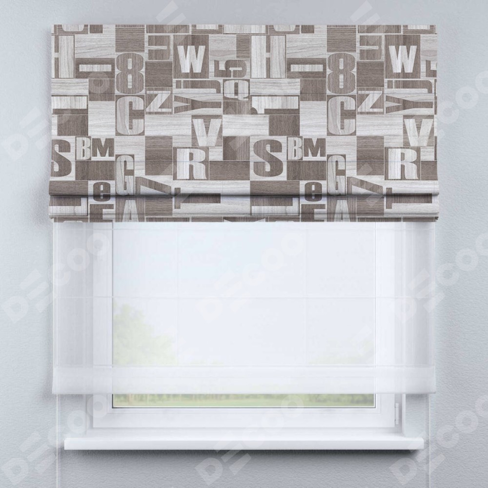 Римская штора день-ночь производителя «Cortin», используется для проёма, пошита из двух полотен, с лицевой блэкаут с нанесением сублимационной печати «Литеры лофт», вторая ткань тюль (по стандарту комплектуется тюль белого цвета артикул V-01). Имеет универсальный механизм и подходит для монтажа: на потолок, на стену и в нишу.