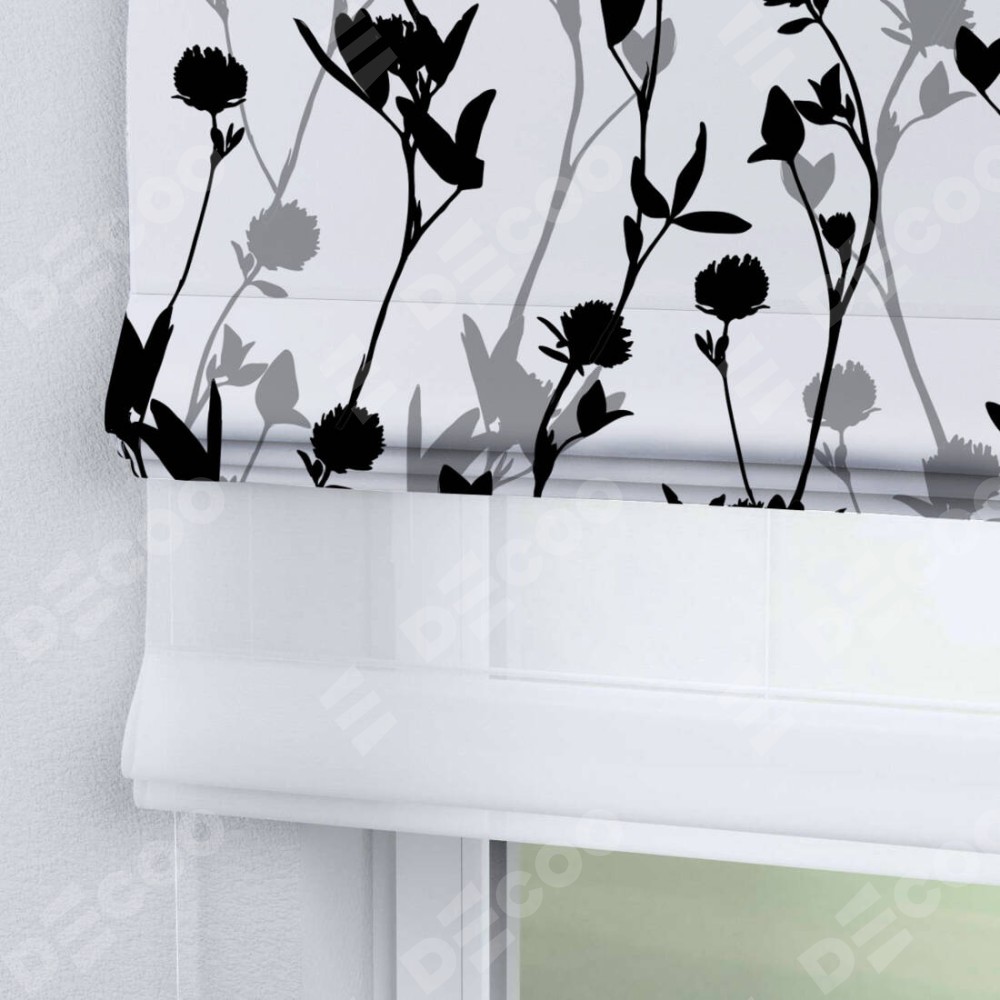 Римская штора день-ночь производителя «Cortin», используется для проёма, пошита из двух полотен, с лицевой блэкаут с нанесением сублимационной печати «Цветочный силуэт», вторая ткань тюль (по стандарту комплектуется тюль белого цвета артикул V-01). Имеет универсальный механизм и подходит для монтажа: на потолок, на стену и в нишу.