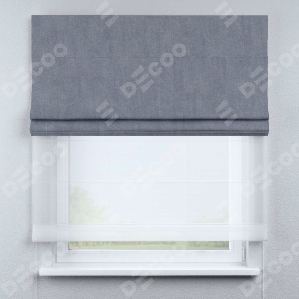 Римская штора день-ночь производителя «Cortin», используется для проёма, пошита из двух полотен, с лицевой стороны канвас васильковый артикул v-203, вторая ткань тюль (по стандарту комплектуется тюль белого цвета артикул V-01). Имеет универсальный механизм и подходит для монтажа: на потолок, на стену и в нишу.