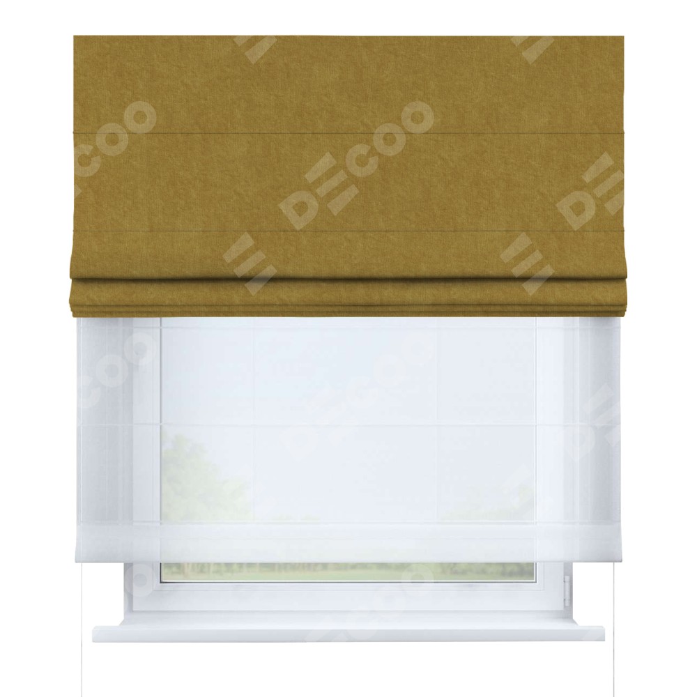 Римская штора день-ночь производителя «Cortin», используется для проёма, пошита из двух полотен, с лицевой стороны канвас горчица артикул v-476, вторая ткань тюль (по стандарту комплектуется тюль белого цвета артикул V-01). Имеет универсальный механизм и подходит для монтажа: на потолок, на стену и в нишу.