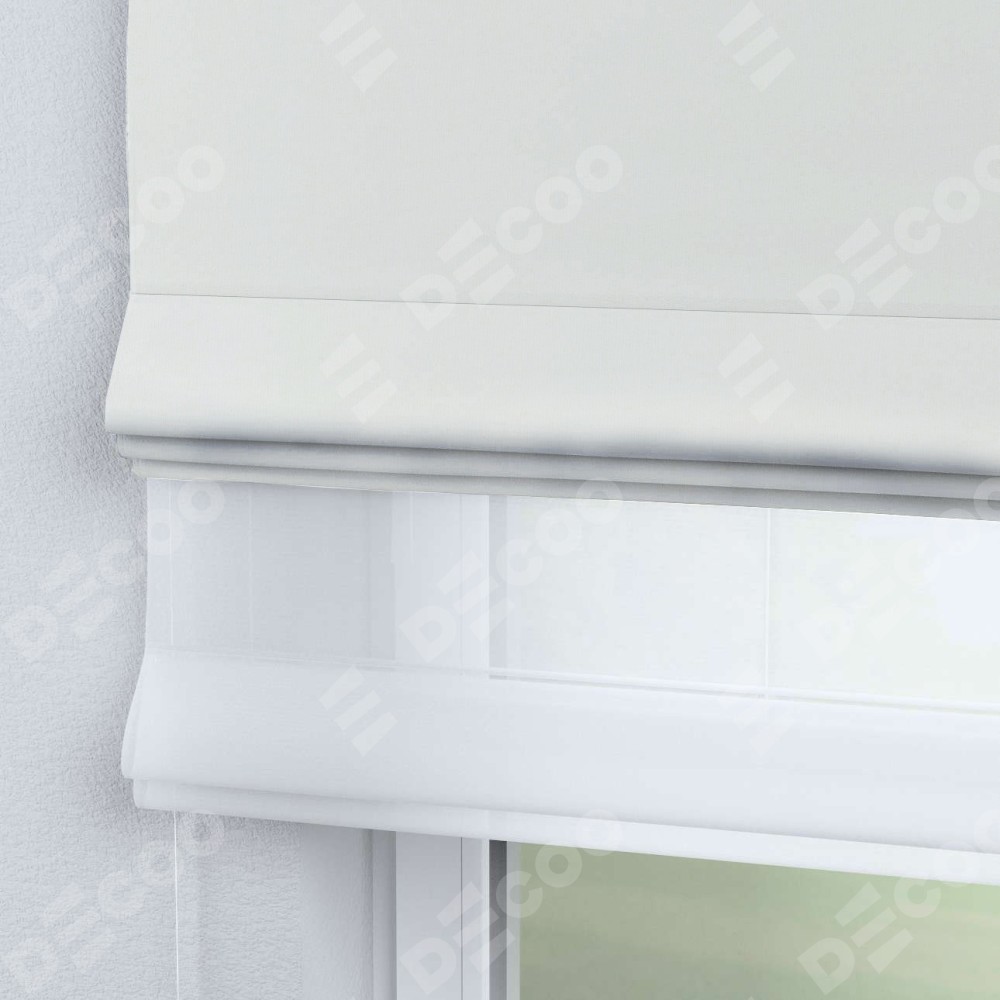 Римская штора день-ночь производителя «Cortin», используется для проёма, пошита из двух полотен, с лицевой стороны канвас молочный артикул v-93, вторая ткань тюль (по стандарту комплектуется тюль белого цвета артикул V-01). Имеет универсальный механизм и подходит для монтажа: на потолок, на стену и в нишу.