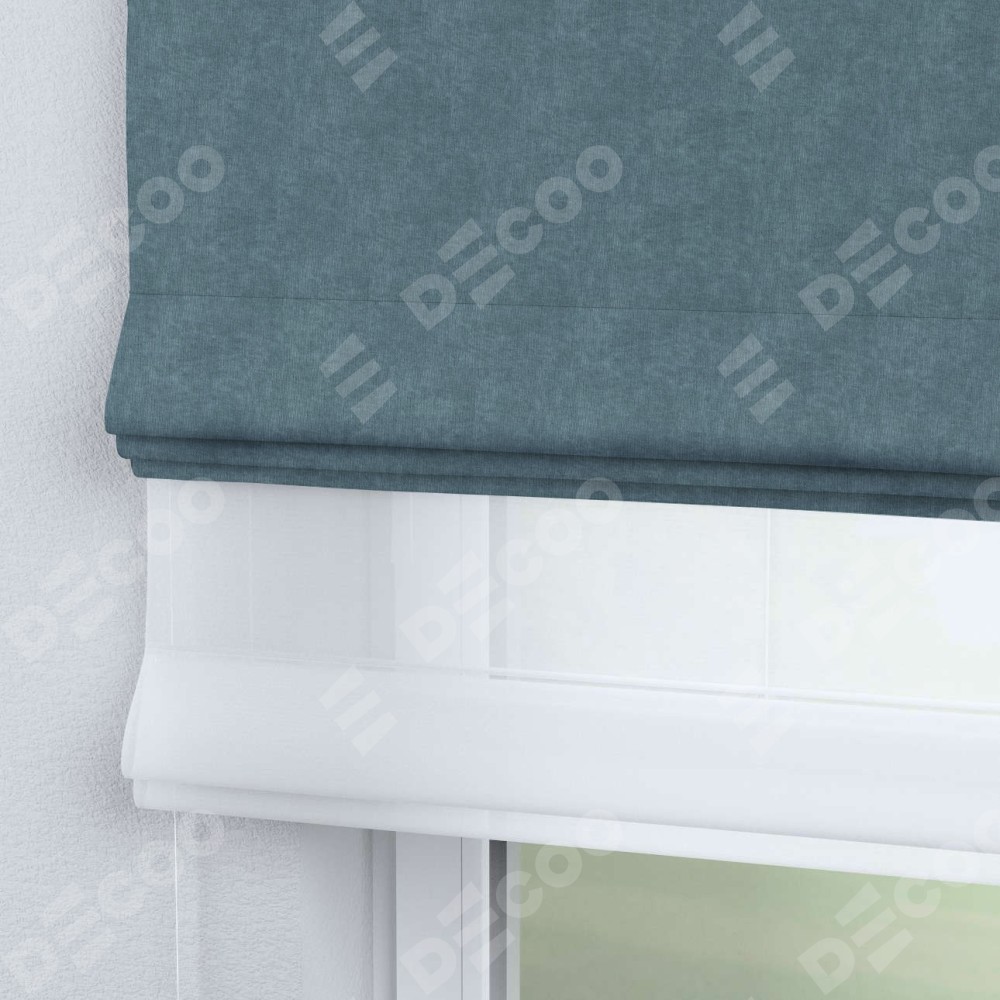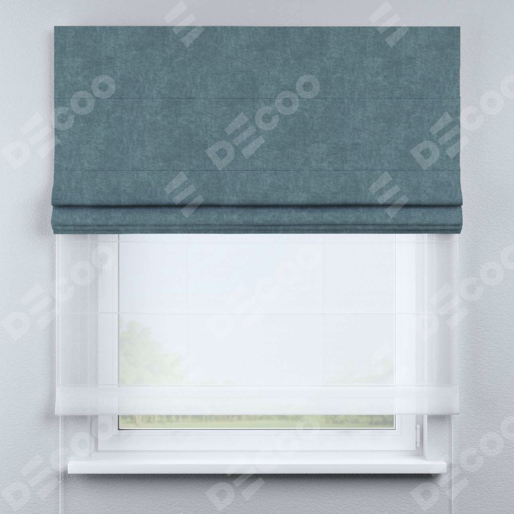 Римская штора день-ночь производителя «Cortin», используется для проёма, пошита из двух полотен, с лицевой стороны канвас серо-голубой артикул v-330, вторая ткань тюль (по стандарту комплектуется тюль белого цвета артикул V-01). Имеет универсальный механизм и подходит для монтажа: на потолок, на стену и в нишу.