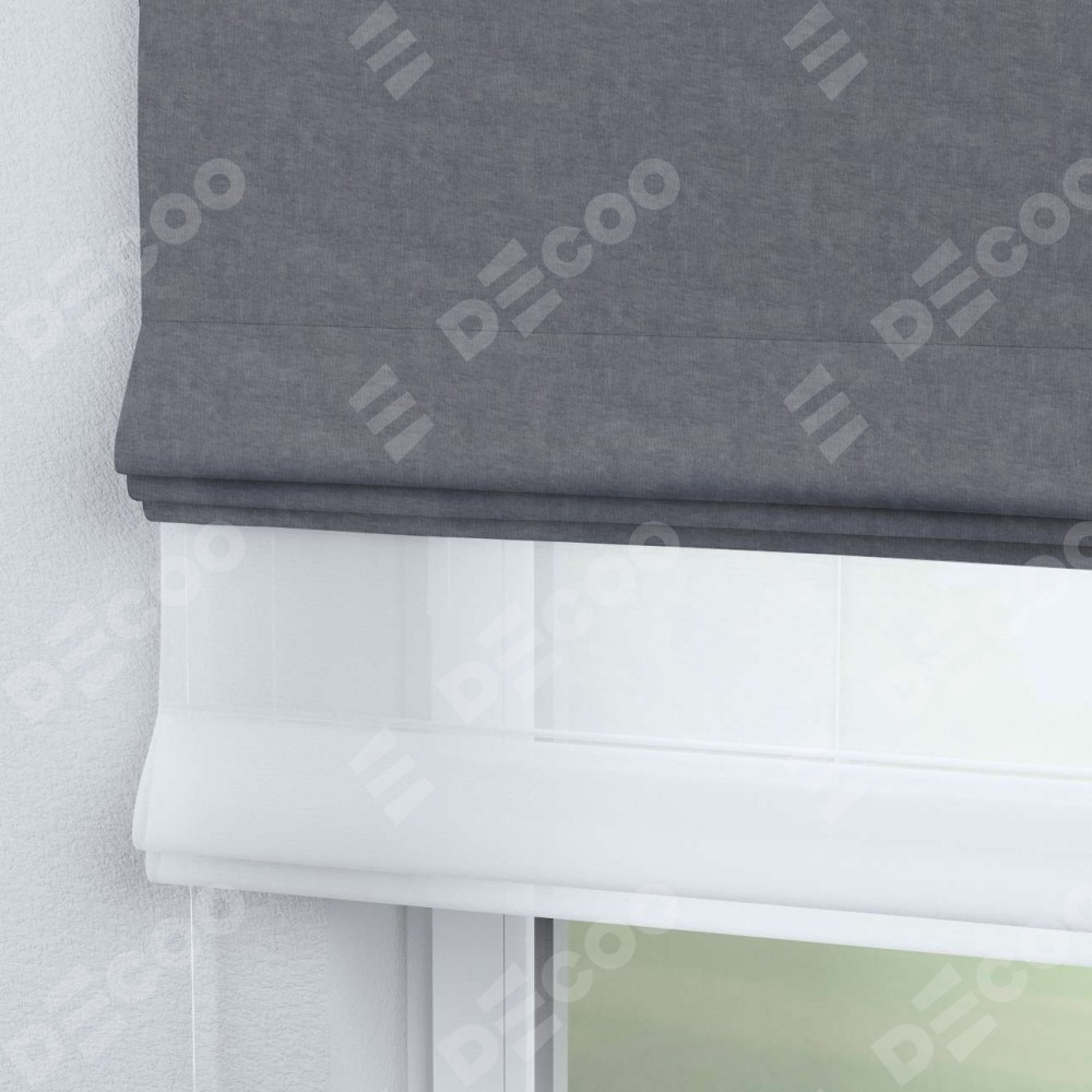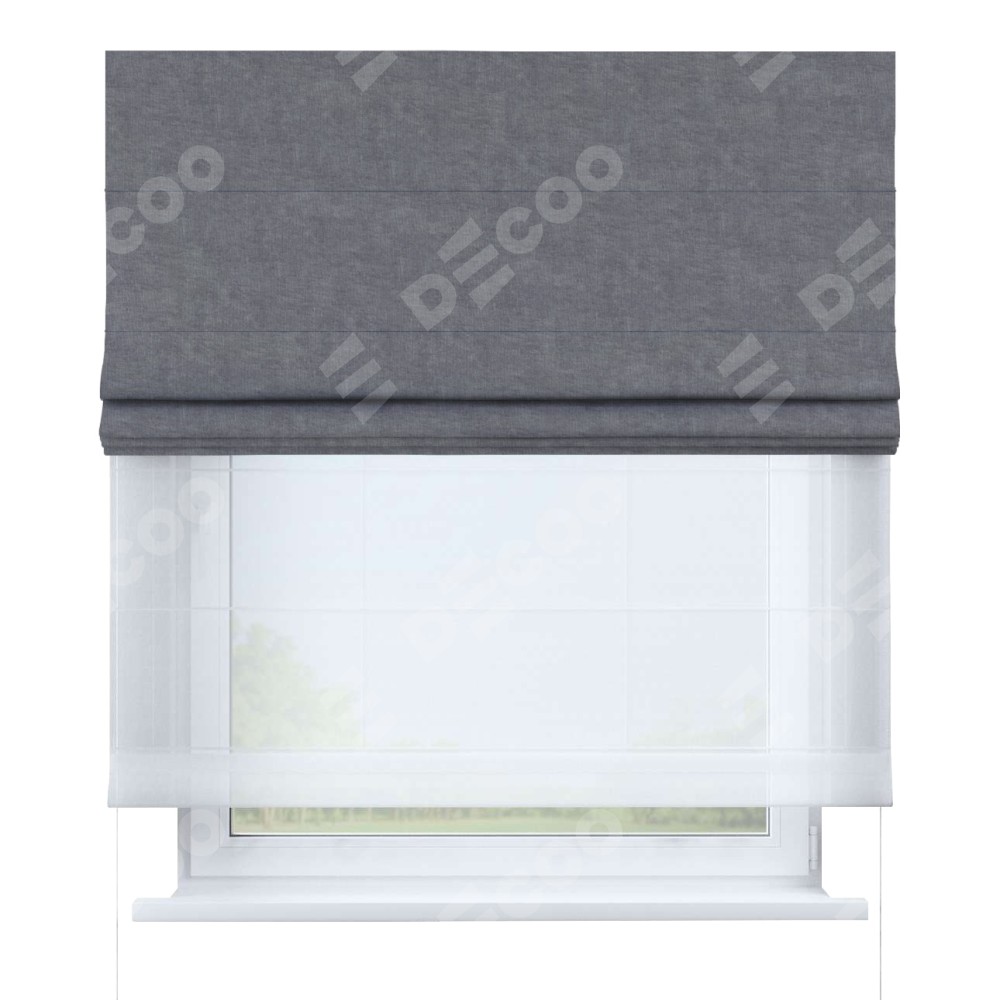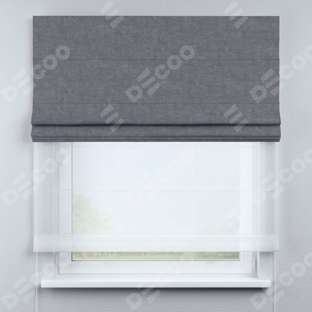 Римская штора день-ночь производителя «Cortin», используется для проёма, пошита из двух полотен, с лицевой стороны канвас стальной артикул v-1082, вторая ткань тюль (по стандарту комплектуется тюль белого цвета артикул V-01). Имеет универсальный механизм и подходит для монтажа: на потолок, на стену и в нишу.