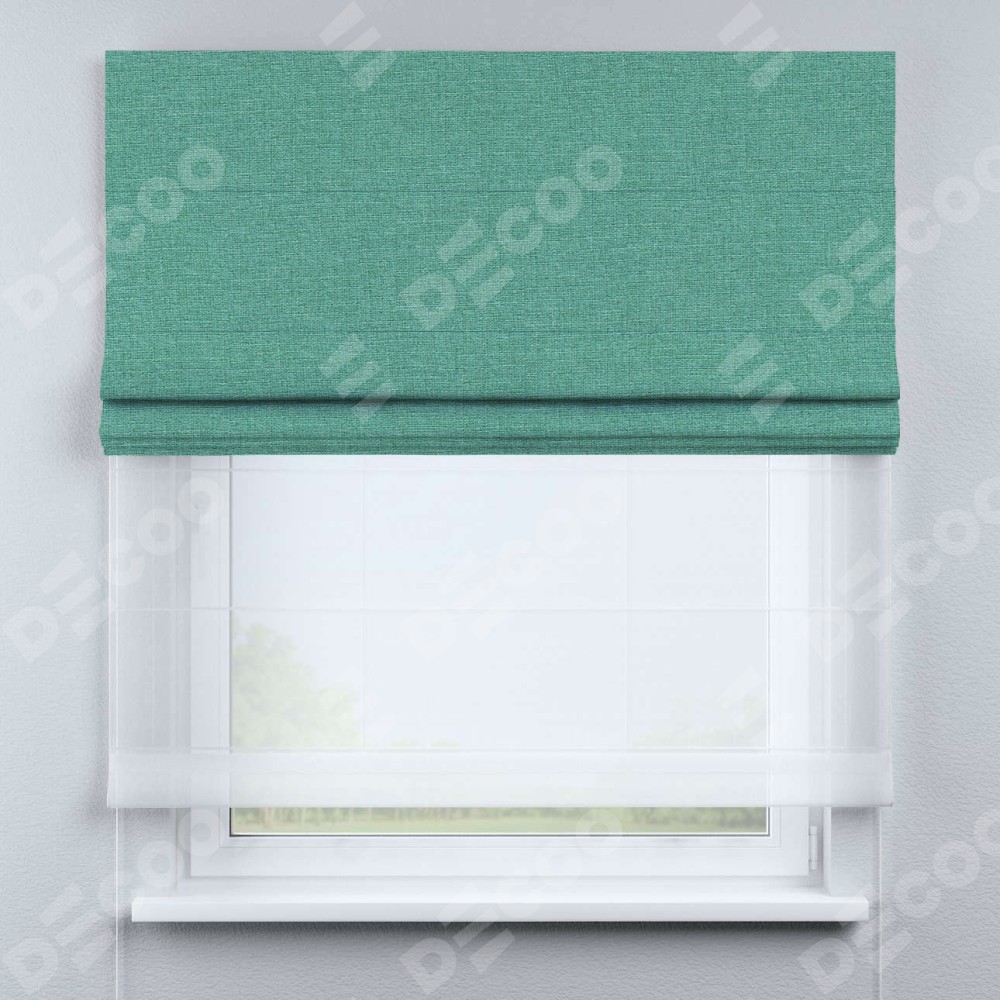 Римская штора день-ночь производителя «Cortin», используется для проёма, пошита из двух полотен, с лицевой стороны лён светло-бирюзовый артикул 53435, вторая ткань тюль (по стандарту комплектуется тюль белого цвета артикул V-01). Имеет универсальный механизм и подходит для монтажа: на потолок, на стену и в нишу.