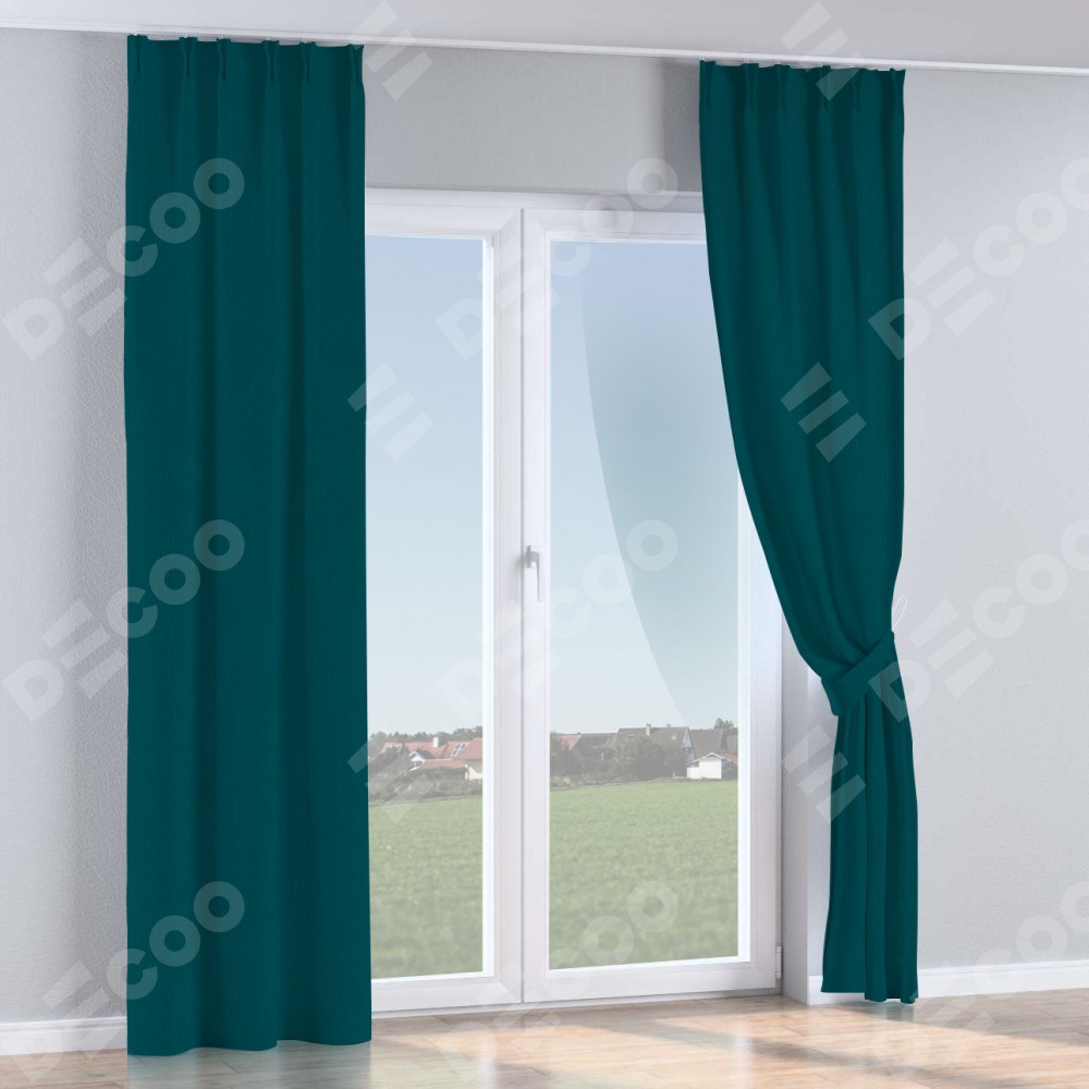 Комплект прямых штор, от производителя «Cortin», пошиты из ткани канвас изумрудный, артикул ткани v-12487. С изнаночной стороны в верхней части штор пристрачивается шторная лента с декоративными складками «Кустик». Для создания элегантных складок прямые шторы шьются по стандарту с коэффициентом 1:2 (на 100 см. ширины проёма 200 см. ширины ткани).