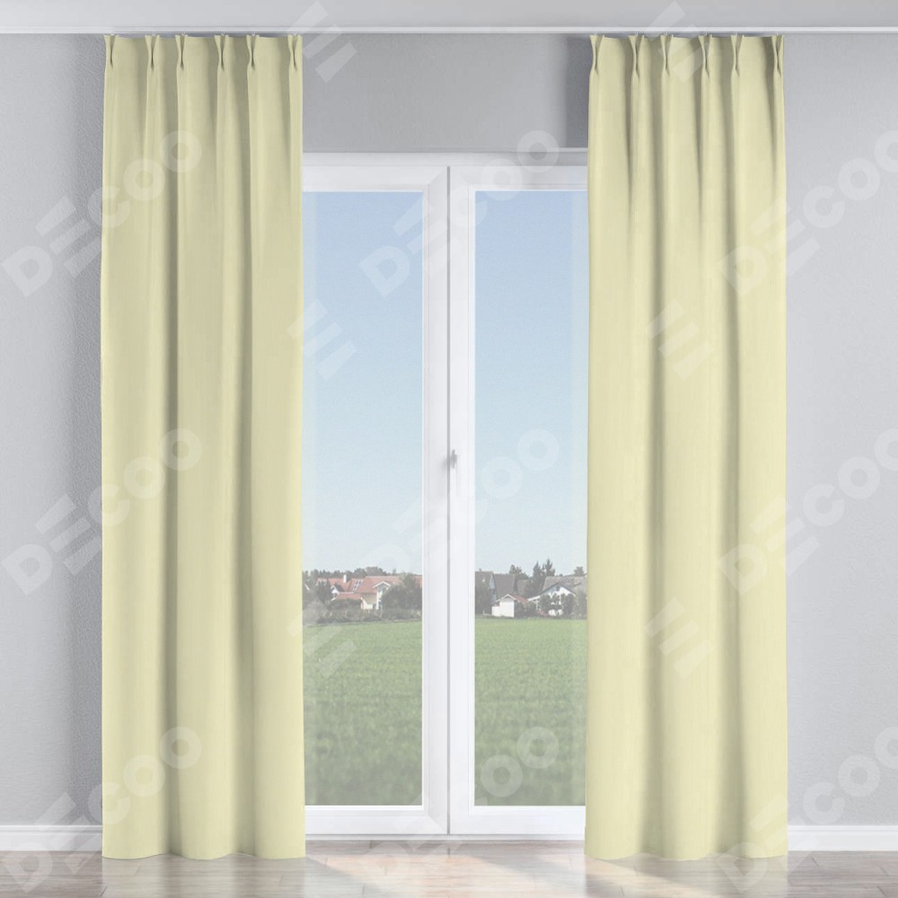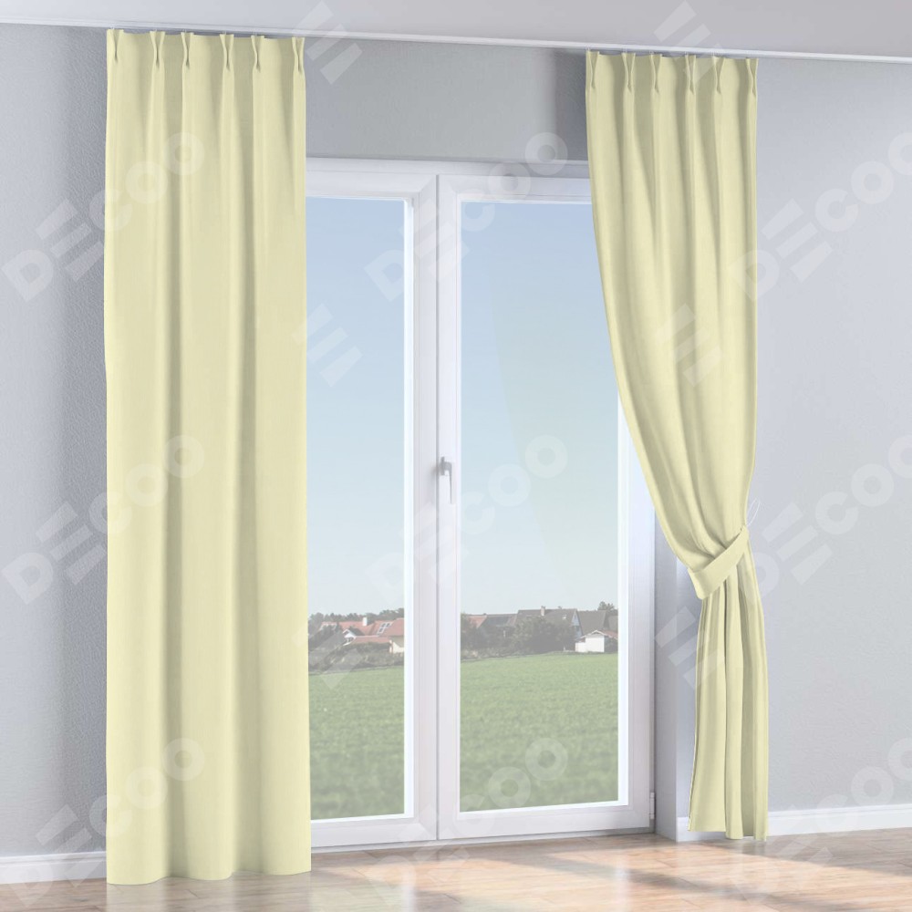 Комплект прямых штор, от производителя «Cortin», пошиты из ткани канвас светло-бежевый, артикул ткани v-250. С изнаночной стороны в верхней части штор пристрачивается шторная лента с декоративными складками «Кустик». Для создания элегантных складок прямые шторы шьются по стандарту с коэффициентом 1:2 (на 100 см. ширины проёма 200 см. ширины ткани).