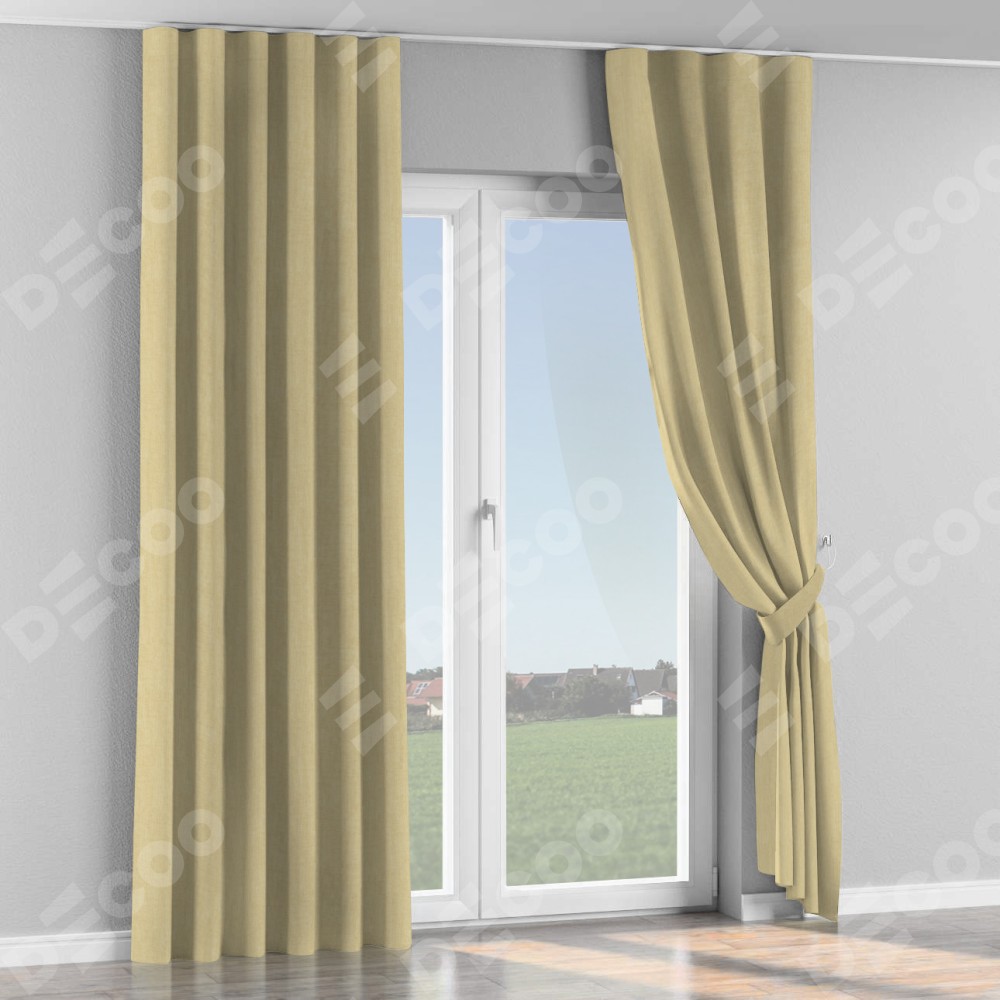 Комплект прямых штор, от производителя «Cortin», пошиты из ткани канвас тёмно-бежевый, артикул ткани v-196. С изнаночной стороны в верхней части штор пристрачивается шторная лента с декоративными складками «Волна». Для создания элегантных складок прямые шторы шьются по стандарту с коэффициентом 1:2 (на 100 см. ширины проёма 200 см. ширины ткани).