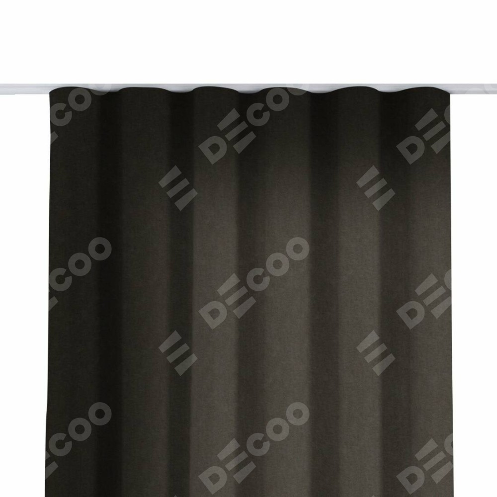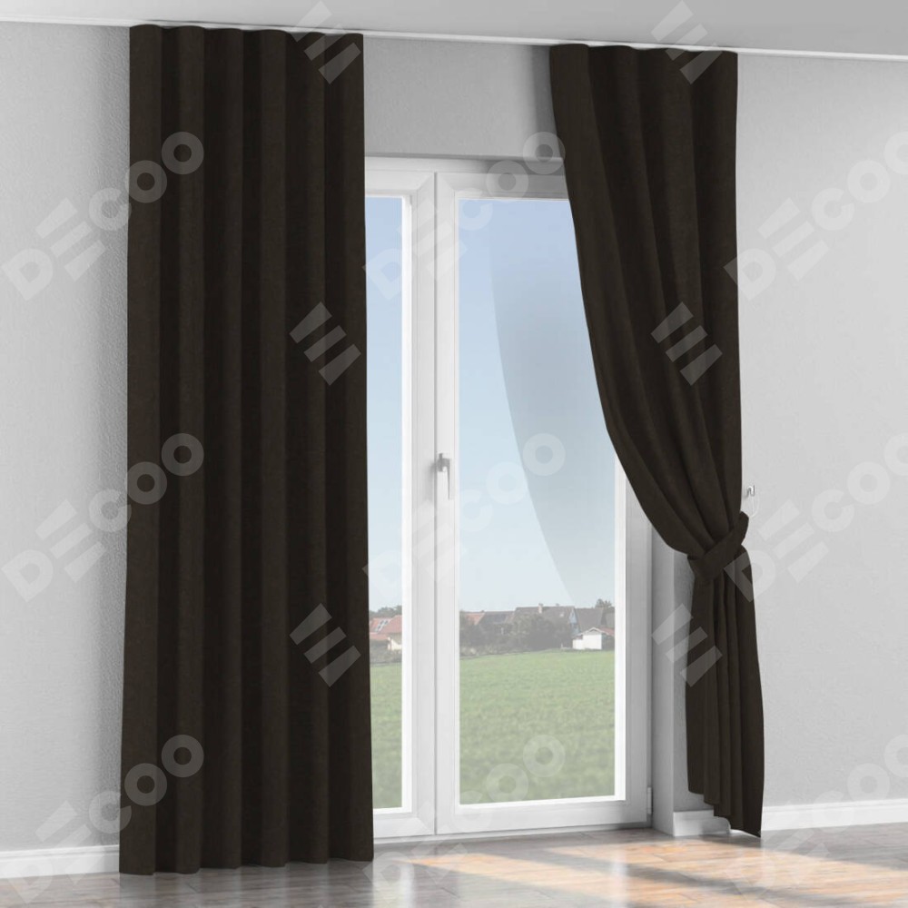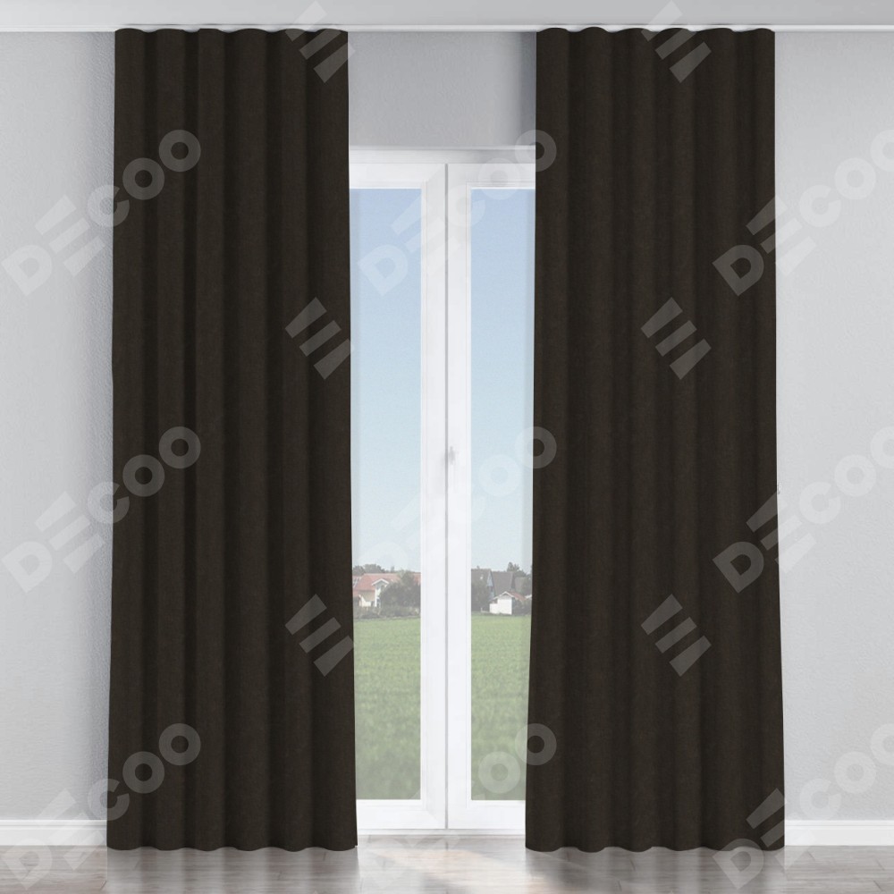 Комплект прямых штор, от производителя «Cortin», пошиты из ткани канвас тёмно-коричневый, артикул ткани v-13. С изнаночной стороны в верхней части штор пристрачивается шторная лента с декоративными складками «Волна». Для создания элегантных складок прямые шторы шьются по стандарту с коэффициентом 1:2 (на 100 см. ширины проёма 200 см. ширины ткани).