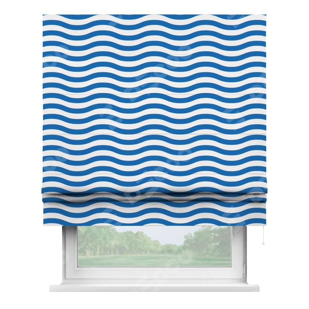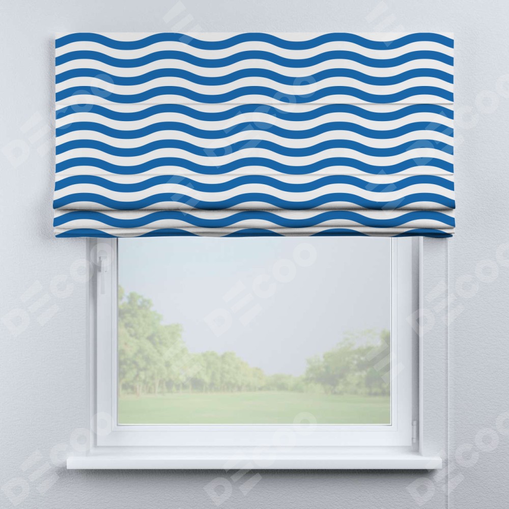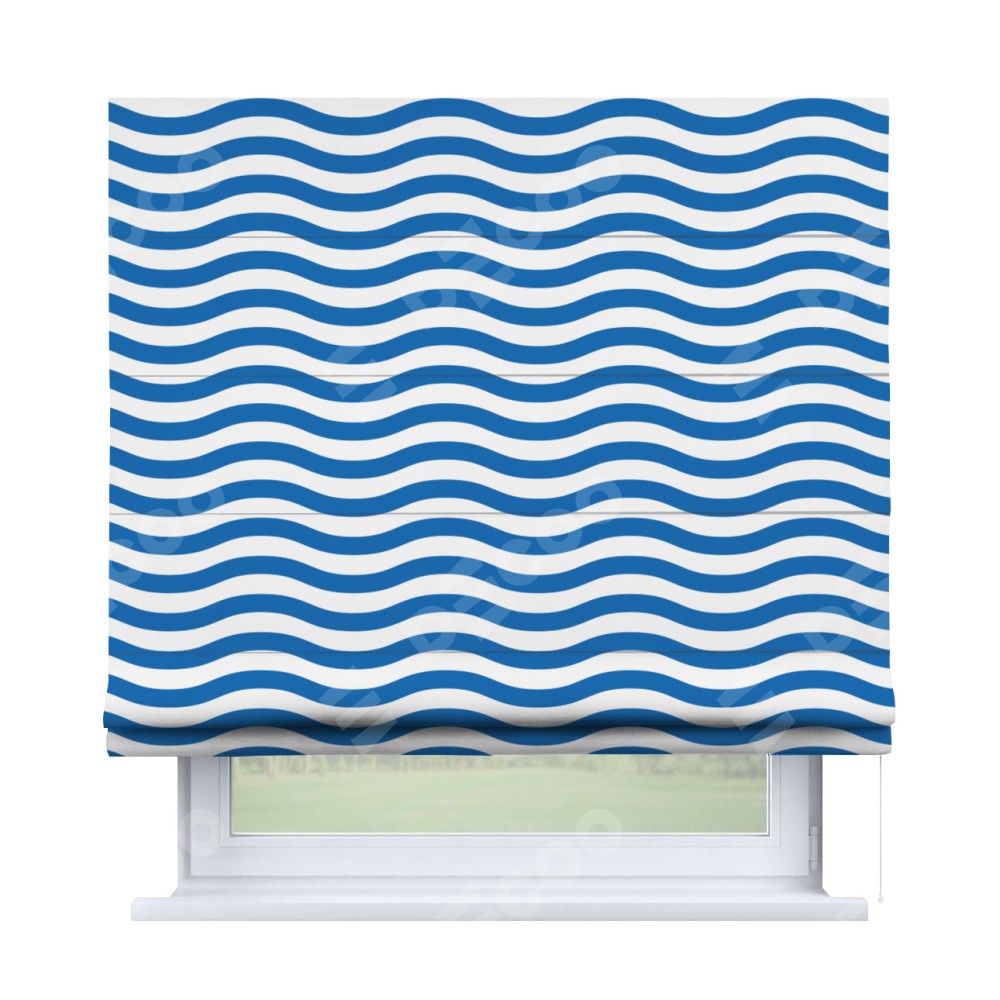 Римская штора производителя «Cortin», используется для проёма, пошита из ткани блэкаут с нанесением сублимационной печати «Волнистые линии». Имеет универсальный механизм и подходит для монтажа: на потолок, на стену и в нишу.