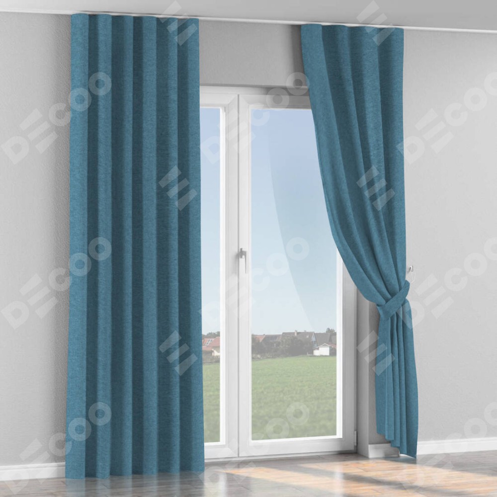 Комплект прямых штор, от производителя «Cortin», пошиты из ткани твид блэкаут светло-синий, артикул ткани 90935. С изнаночной стороны в верхней части штор пристрачивается шторная лента с декоративными складками «Волна». Для создания элегантных складок прямые шторы шьются по стандарту с коэффициентом 1:2 (на 100 см. ширины проёма 200 см. ширины ткани).