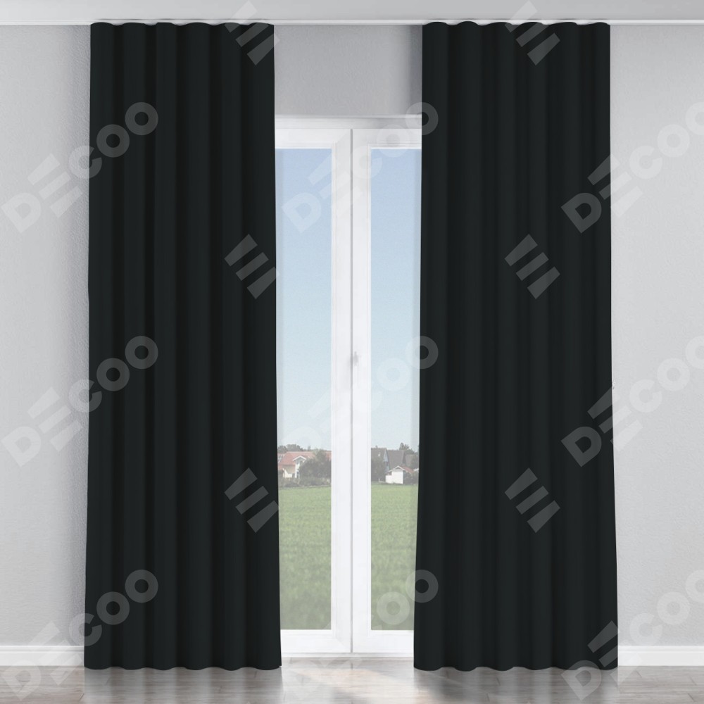 Комплект прямых штор, от производителя «Cortin», пошиты из ткани блэкаут однотонный черный, артикул ткани 91571−2. С изнаночной стороны в верхней части штор пристрачивается шторная лента с декоративными складками «Волна». Для создания элегантных складок прямые шторы шьются по стандарту с коэффициентом 1:2 (на 100 см. ширины проёма 200 см. ширины ткани).