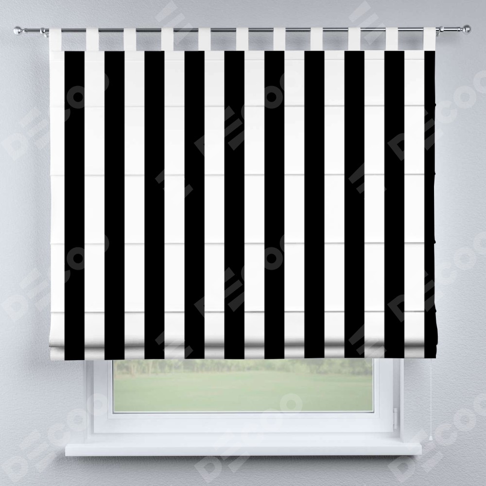 Римская штора производителя «Cortin», используется для проёма, пошита из ткани блэкаут с нанесением сублимационной печати «Черное и белое». Данная модель пошита на петлях, комплектуется на выбор круглым карнизом и подходит для монтажа на стену. Римская штора на петлях имеет простую систему регулировки высоты, отличительным преимуществом данной модели является простой способ монтажа. Достаточно повесить ее на трубу и штора готова!