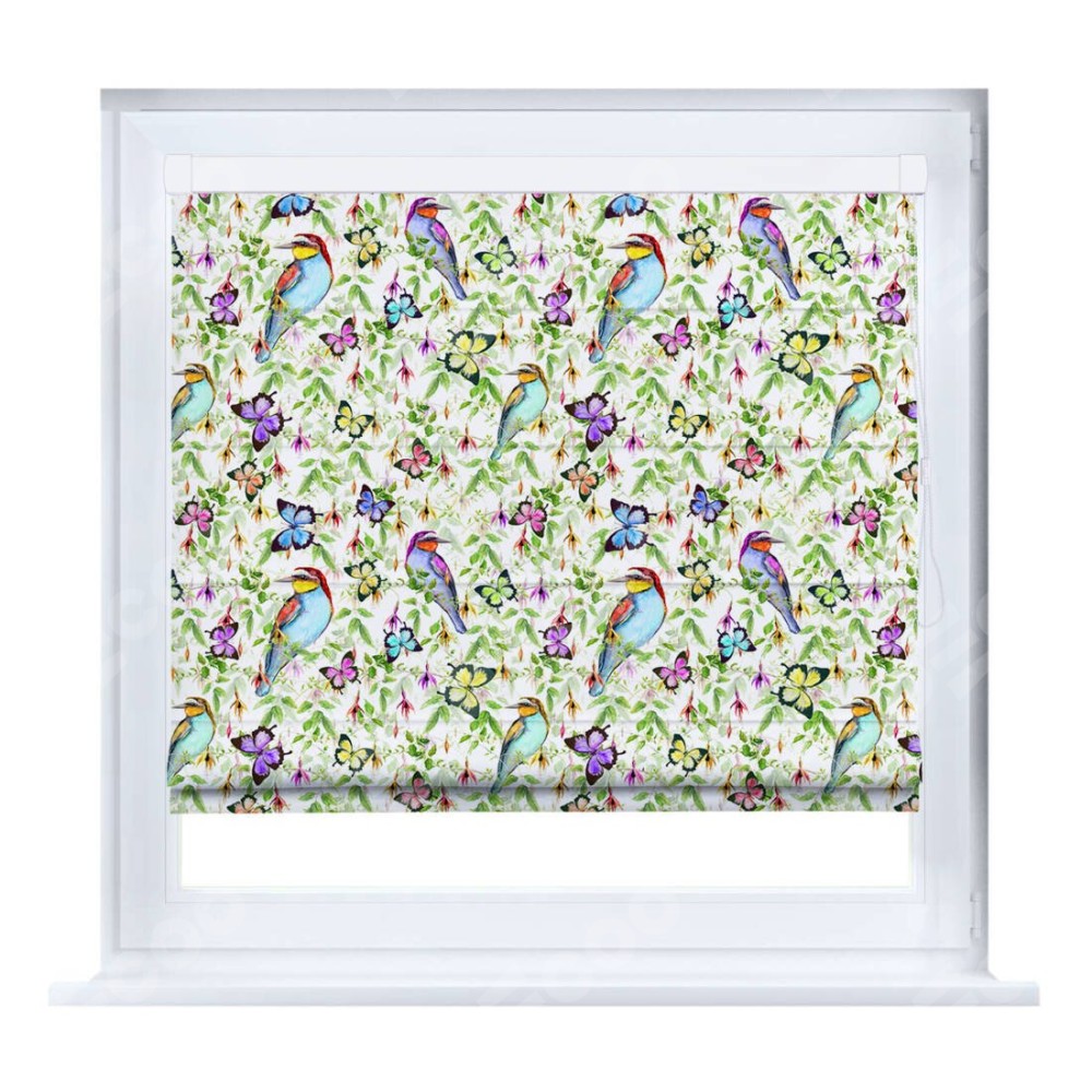 Римская штора производителя «Cortin», устанавливается на створку окна, пошита из ткани блэкаут с нанесением сублимационной печати «Тропические птицы». Штора шьётся по индивидуальным размерам, для данного типа римской шторы возможная ширина от 35 до 150 см., высота до 250 см.