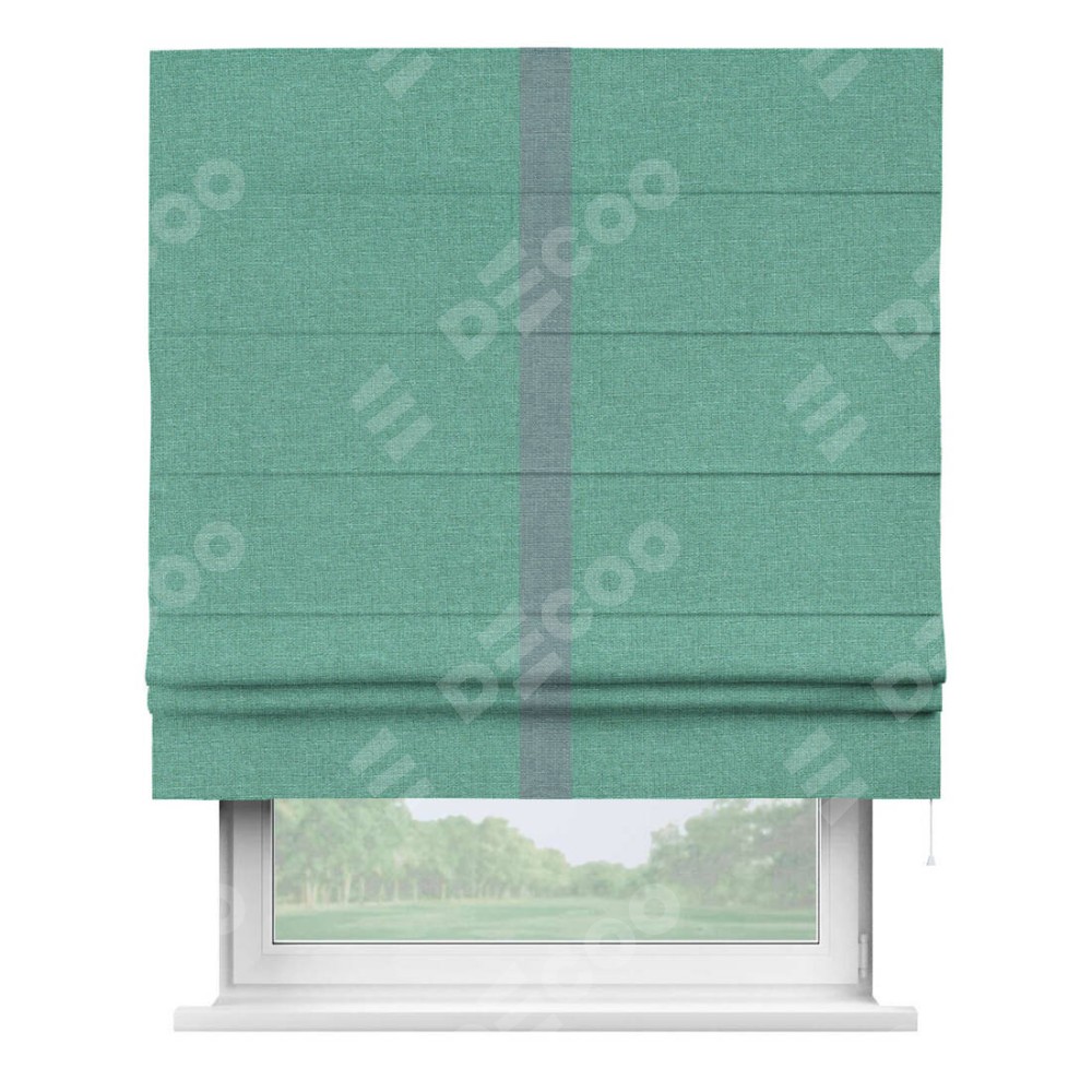 Римская штора производителя «Cortin», используется для проёма, пошита из ткани лён светло-бирюзовый, артикул 53435. Отделка шторы кантом «Хайвэй», ткань для канта используется из льна разной расцветки на выбор. Имеет универсальный механизм и подходит для монтажа: на потолок, на стену и в нишу.