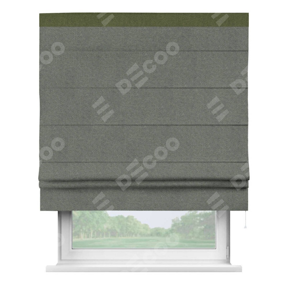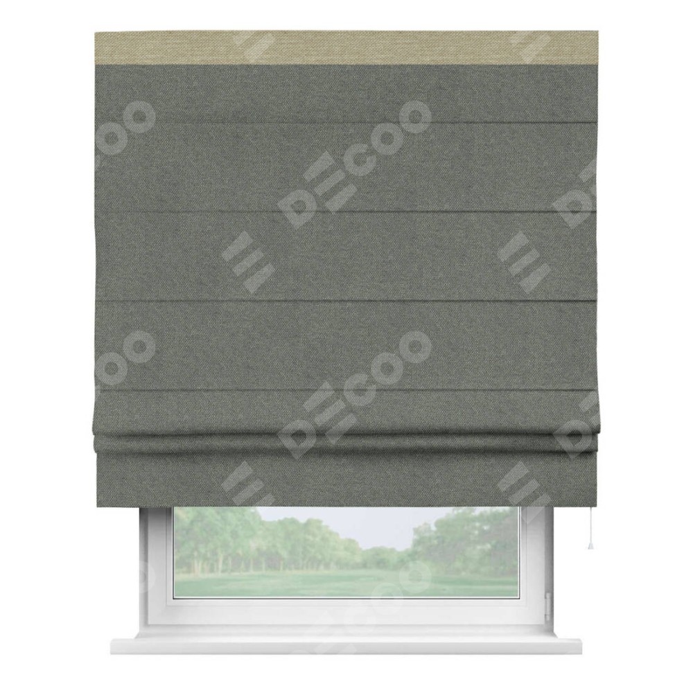 Римская штора производителя «Cortin», используется для проёма, пошита из ткани лён димаут тёмно-серый, артикул 91011. Отделка шторы кантом «Кинг», ткань для канта используется из льна димаут разной расцветки на выбор. Имеет универсальный механизм и подходит для монтажа: на потолок, на стену и в нишу.