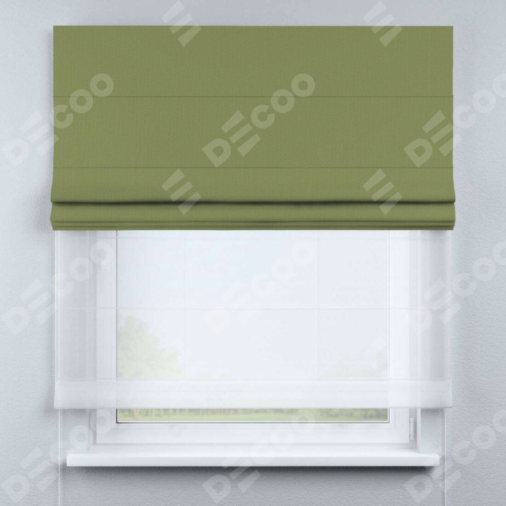 Двойная римская штора «День-ночь» от производителя Cortin предназначена для использования в проёмах. Эта штора уникальна тем, что состоит из двух полотен. На лицевой стороне находится бархат золотая оливка (артикул: 90725), обеспечивающий эффективное затемнение. В комплект также входит вторая ткань — легкий белый тюль (артикул: V-01), который добавляет изящества и легкости оформлению окна. Кроме того, доступны и другие разновидности ткани тюль, выбор которых доступен по ссылке .