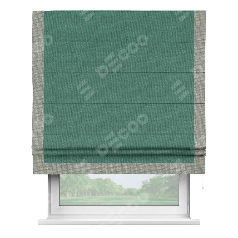 Римская штора производителя «Cortin», используется для проёма, пошита из ткани лён димаут светло-бирюзовый, артикул 91005. Отделка шторы кантом «Виктория», ткань для канта используется из льна димаут разной расцветки на выбор. Имеет универсальный механизм и подходит для монтажа: на потолок, на стену и в нишу.