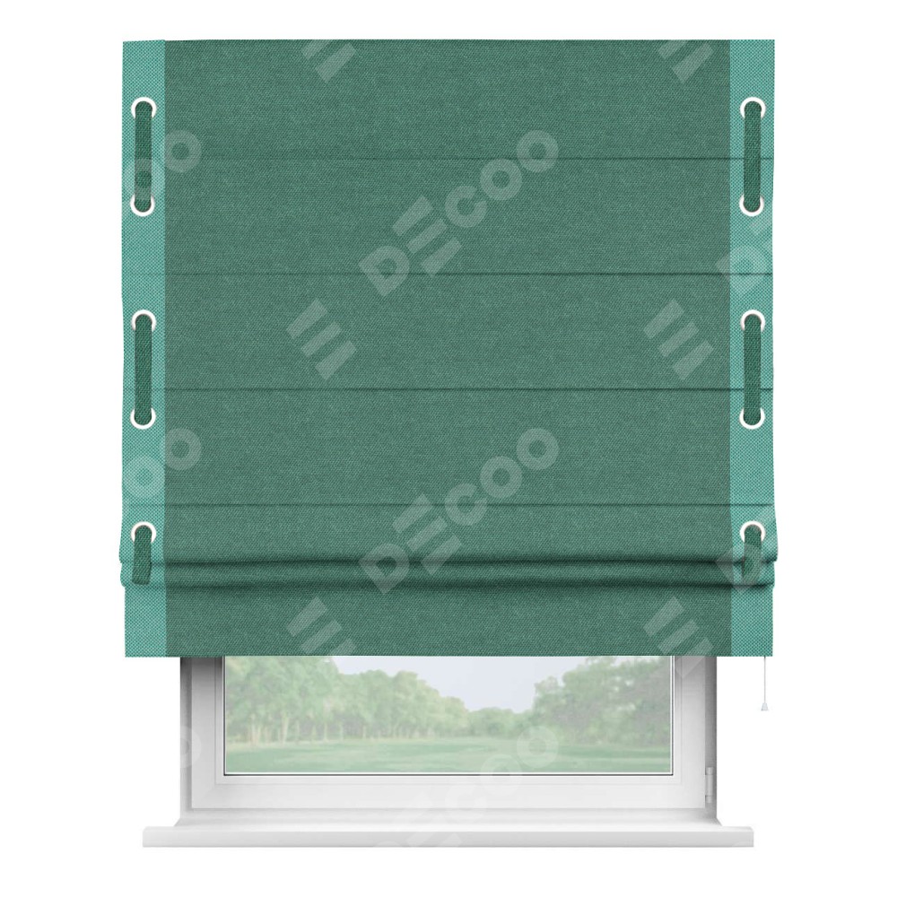 Римская штора производителя «Cortin», используется для проёма, пошита из ткани лён димаут светло-бирюзовый, артикул 91005. Отделка шторы кантом «Стрим Дуо» на кантах расположены люверсы с пояском, ткань для канта используется лён димаут разной расцветки на выбор. Ткань для пояска обычно используется из основной ткани шторы, а так же можно сделать из любой расцветки по желанию. Имеет универсальный механизм и подходит для монтажа: на потолок, на стену и в нишу.