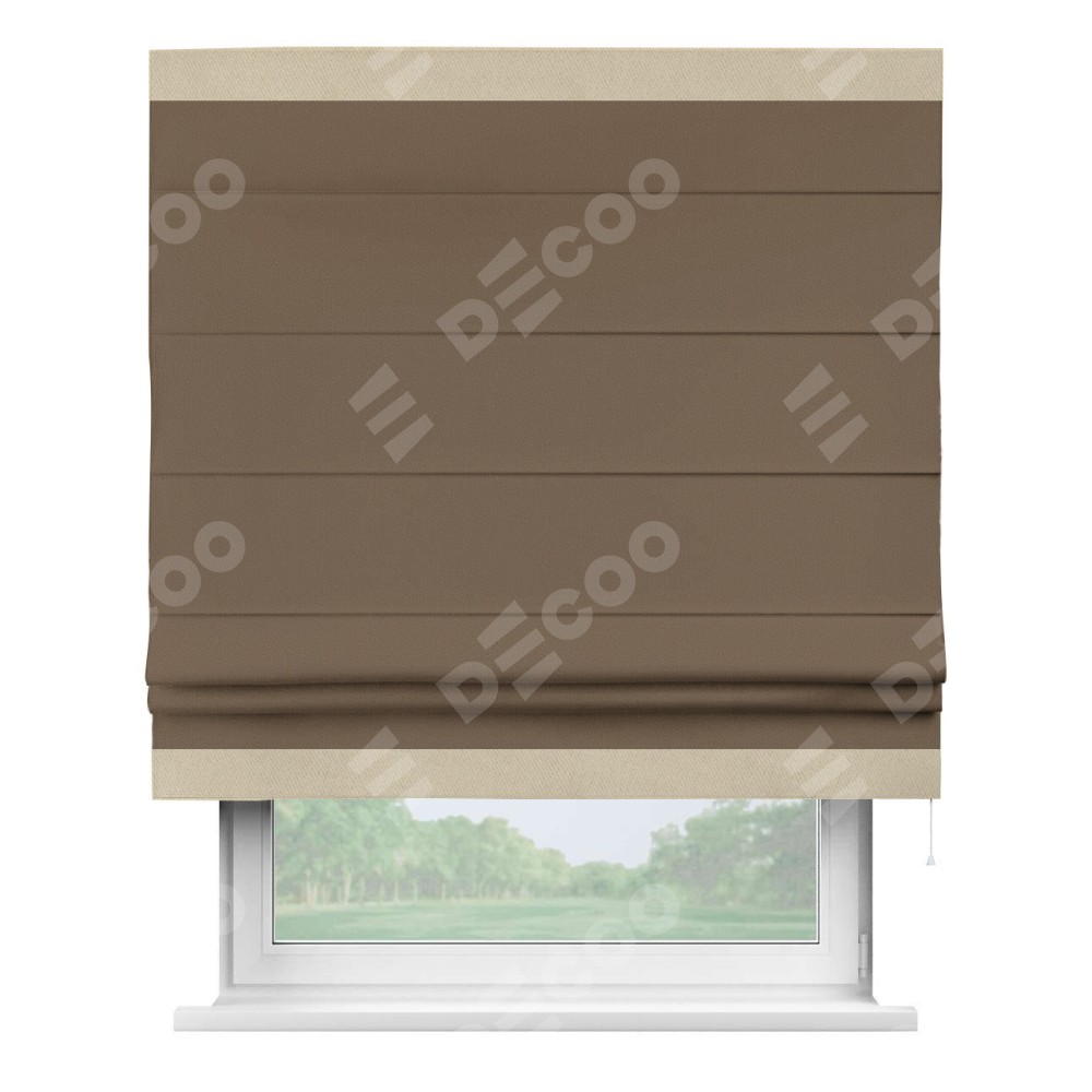 Римская штора производителя «Cortin», используется для проёма, пошита из ткани блэкаут однотонный коричневый, артикул ткани 91334. Отделка шторы кантом «Горизонт», ткань для канта используется из блэкаута однотонного разной расцветки на выбор. Имеет универсальный механизм и подходит для монтажа: на потолок, на стену и в нишу.