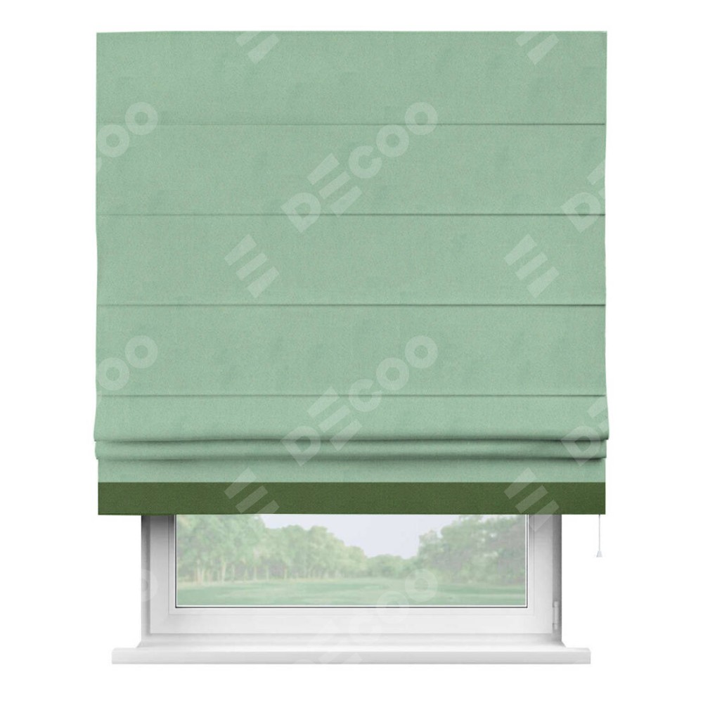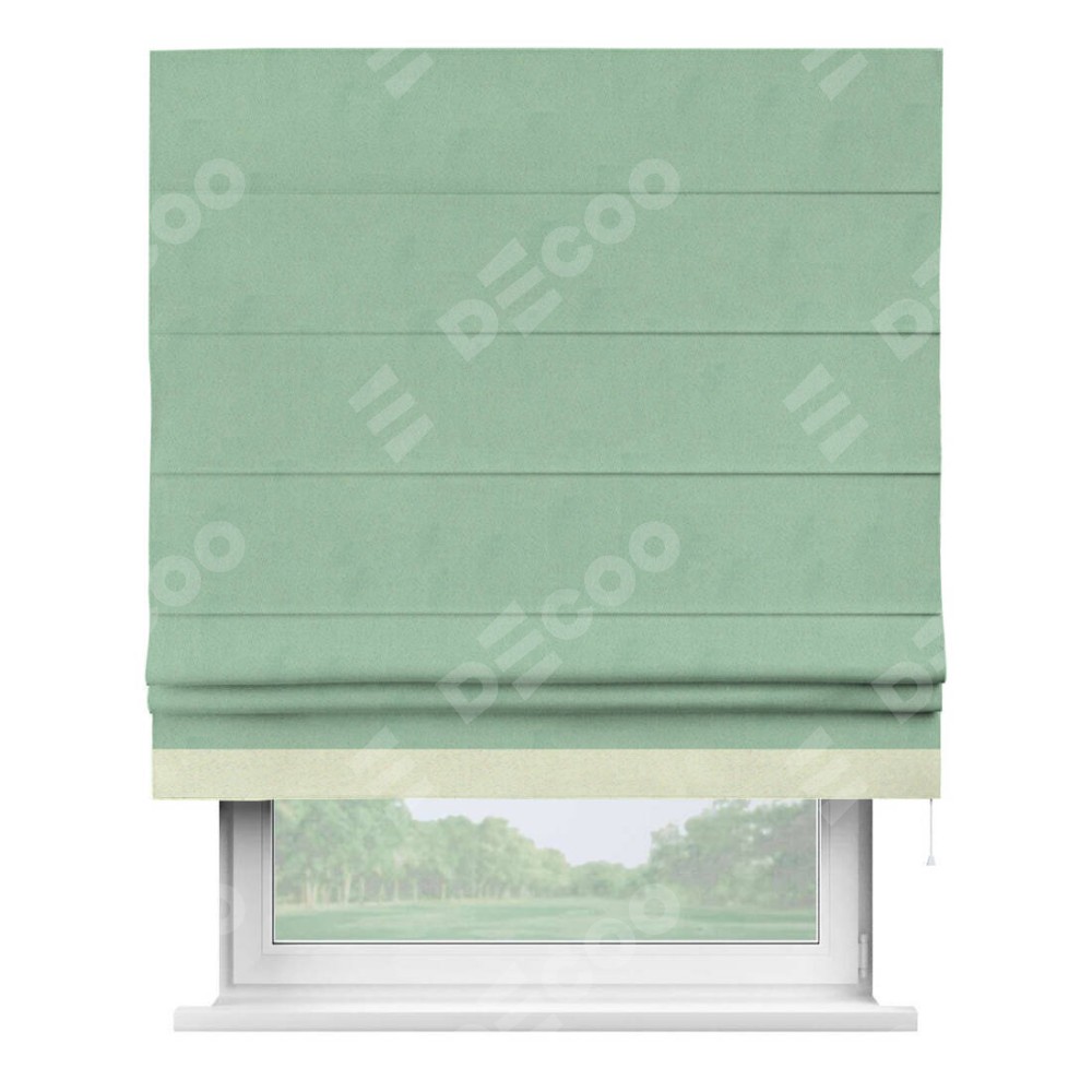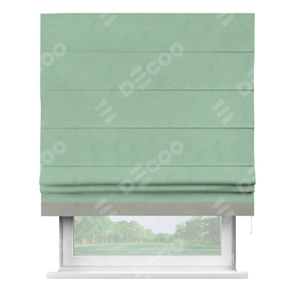 Римская штора производителя «Cortin», используется для проёма, пошита из ткани блэкаут однотонный ментоловый, артикул ткани 91572−1. Отделка шторы кантом «Джестер», ткань для канта используется из блэкаута однотонного разной расцветки на выбор. Имеет универсальный механизм и подходит для монтажа: на потолок, на стену и в нишу.