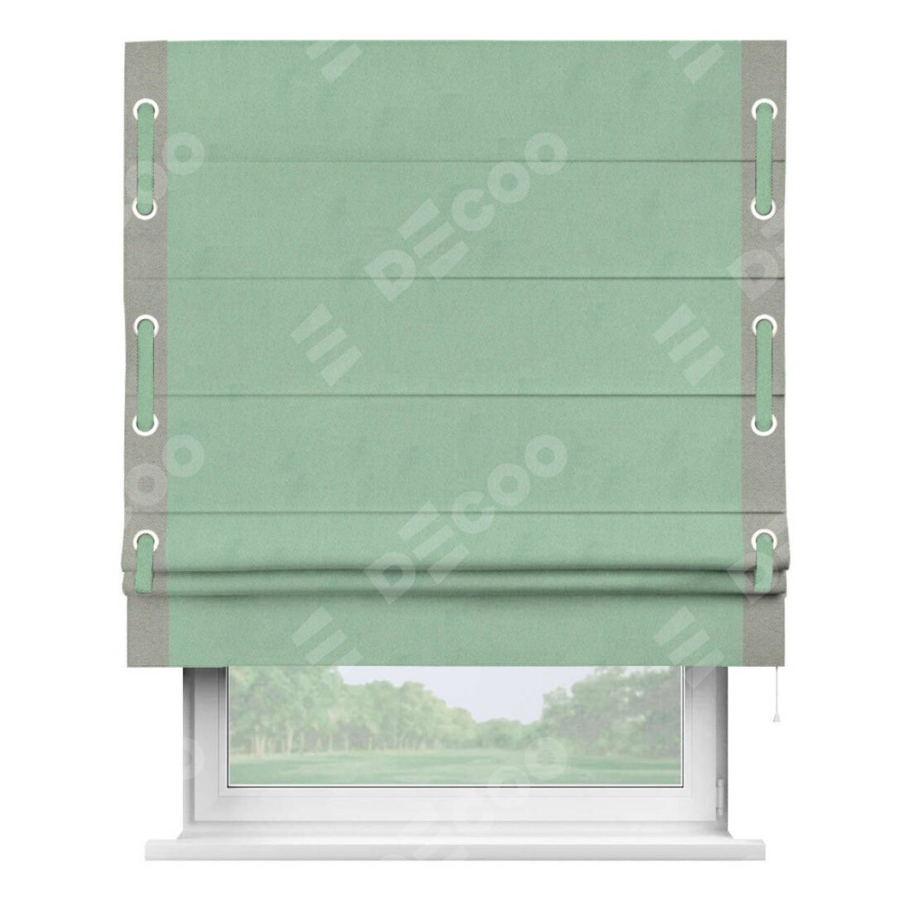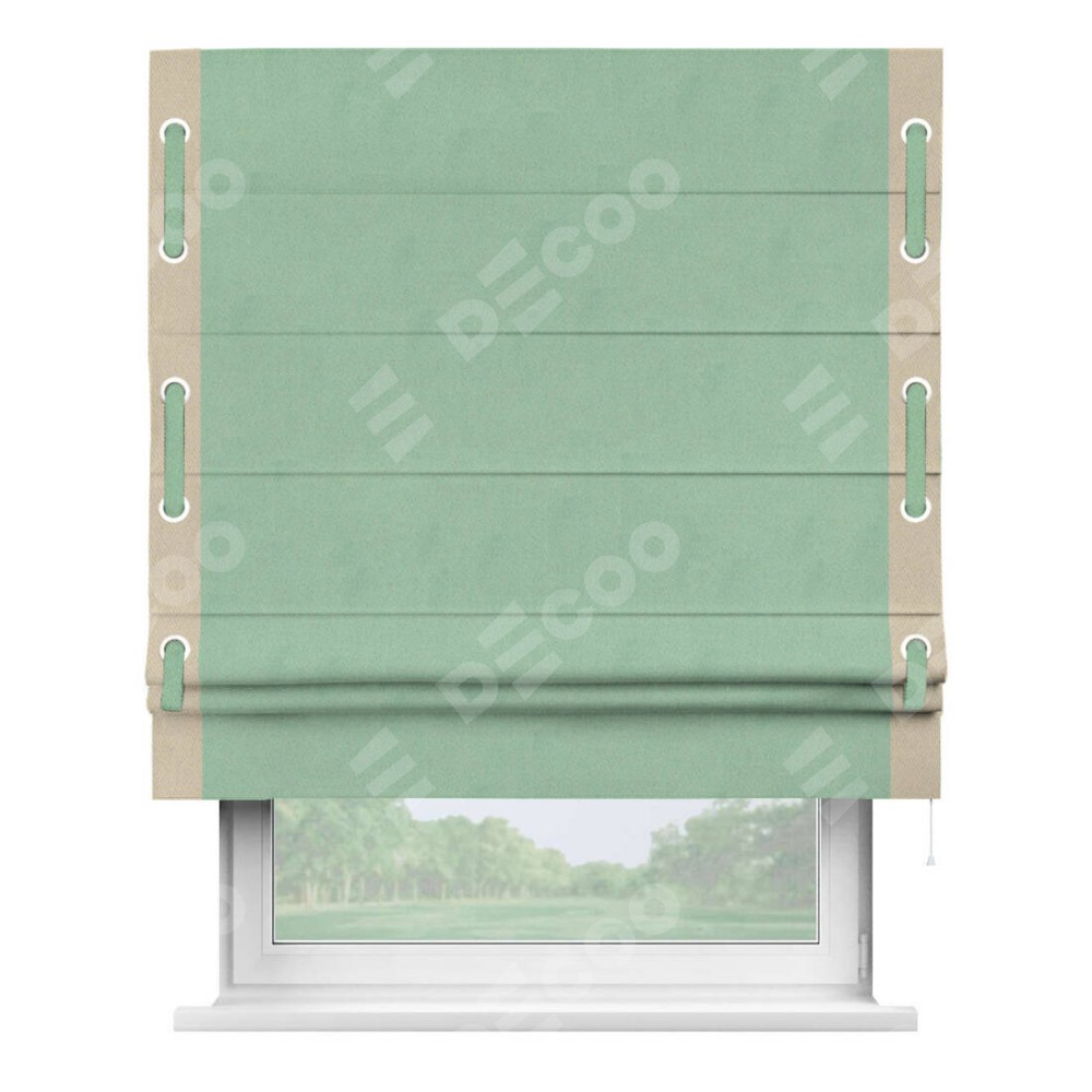 Римская штора производителя «Cortin», используется для проёма, пошита из ткани блэкаут однотонный ментоловый, артикул ткани 91572−1. Отделка шторы кантом «Стрим Дуо» на кантах расположены люверсы с пояском, ткань для канта используется из блэкаута однотонного разной расцветки на выбор. Ткань для пояска обычно используется из основной ткани шторы, а так же можно сделать из любой расцветки по желанию. Имеет универсальный механизм и подходит для монтажа: на потолок, на стену и в нишу.