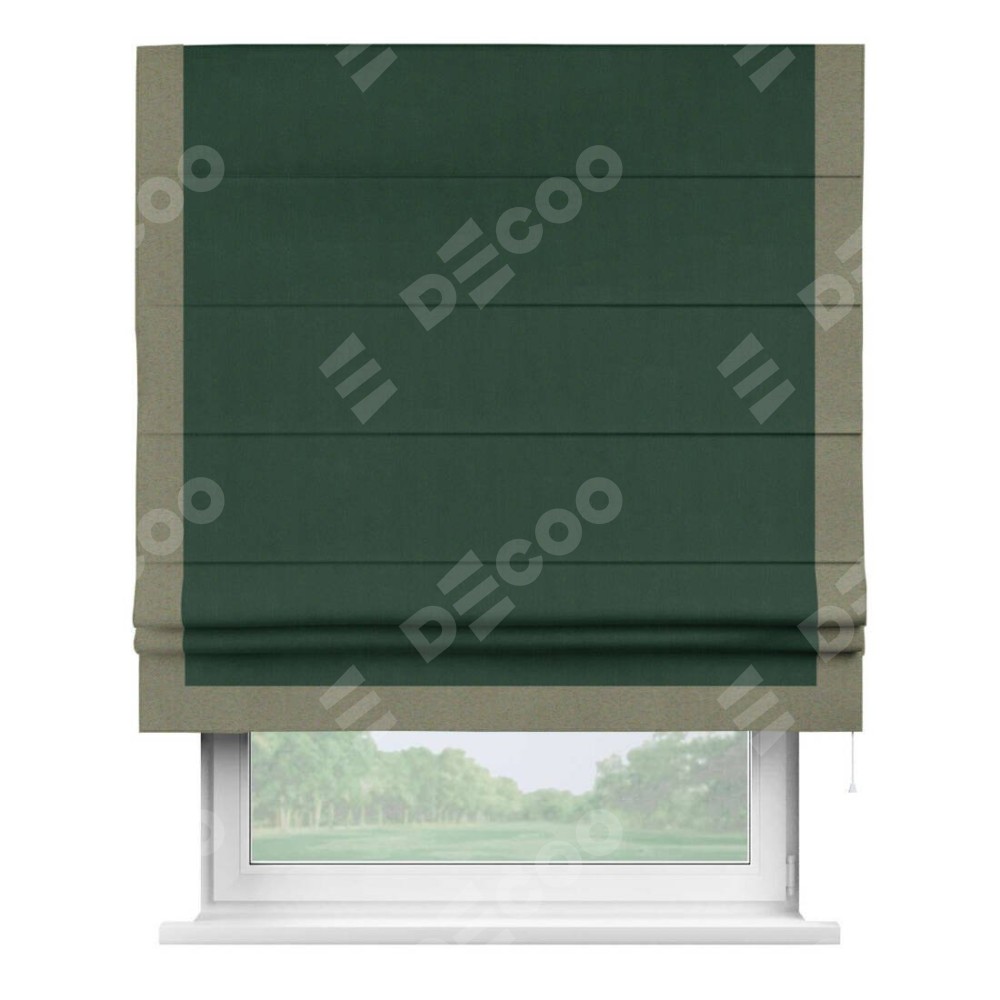 Римская штора производителя «Cortin», используется для проёма, пошита из ткани блэкаут однотонный зелёный, артикул ткани 91572−2. Отделка шторы кантом «Виктория», ткань для канта используется из блэкаута однотонного разной расцветки на выбор. Имеет универсальный механизм и подходит для монтажа: на потолок, на стену и в нишу.