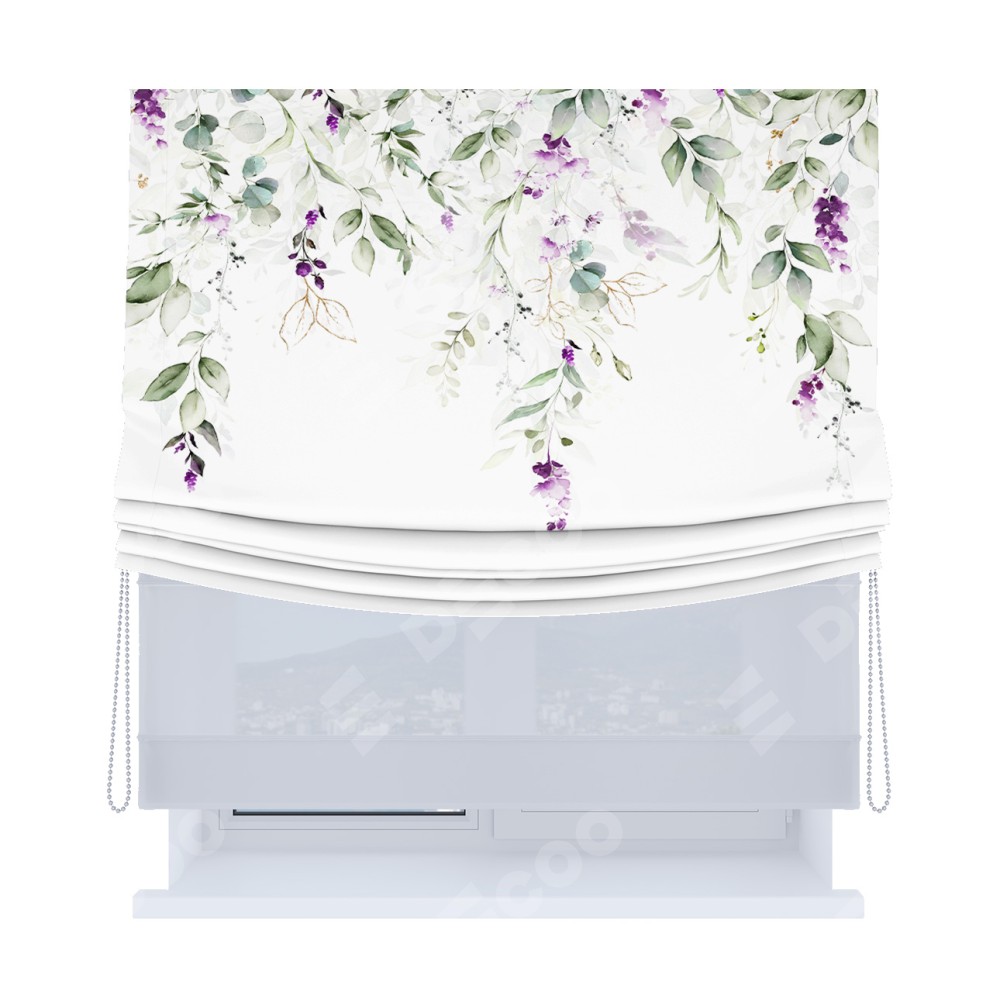 Римская штора день-ночь производителя «Cortin», используется для проёма, пошита из двух полотен, с лицевой блэкаут с нанесением сублимационной печати «Цветочный водопад», вторая ткань тюль (по стандарту комплектуется тюль белого цвета артикул V-01). Имеет универсальный механизм и подходит для монтажа: на потолок, на стену и в нишу. Удобное управление каждой шторой отдельно.