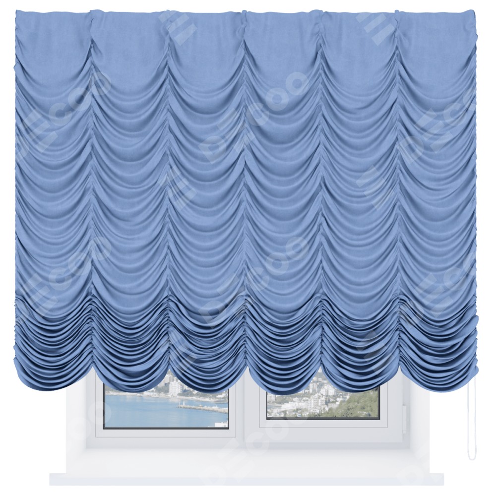 Французская штора производителя «Cortin», используется для проёма, пошита из ткани вельвет васильковый, артикул ткани 33799. Имеет универсальный механизм и подходит для монтажа: на потолок и на стену.