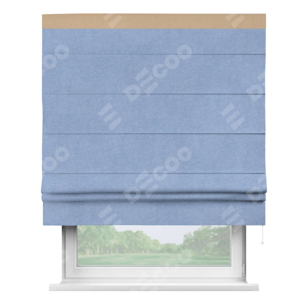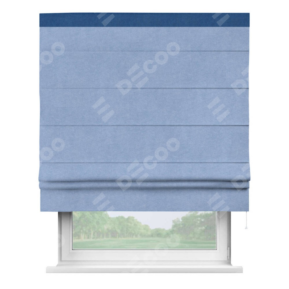 Римская штора производителя «Cortin», используется для проёма, пошита из ткани вельвет васильковый, артикул ткани 33799. Отделка шторы кантом «Кинг», ткань для канта используется из вельвета разной расцветки на выбор. Имеет универсальный механизм и подходит для монтажа: на потолок, на стену и в нишу.