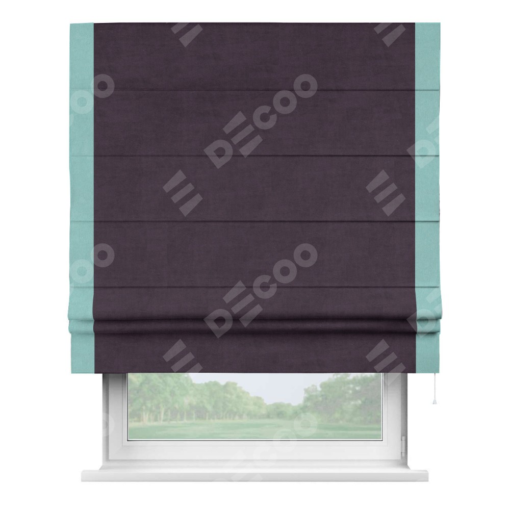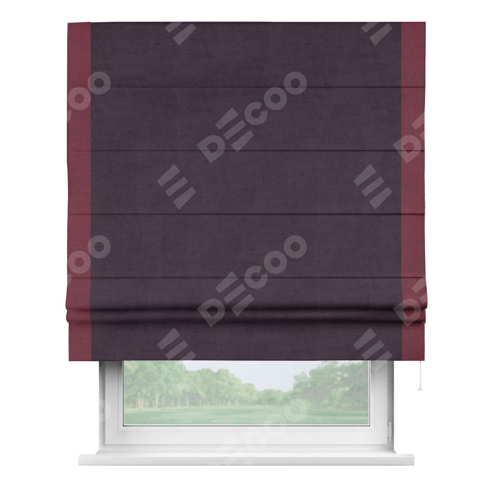 Римская штора производителя «Cortin», используется для проёма, пошита из ткани вельвет тёмно-фиолетовый, артикул ткани 72403. Отделка шторы кантом «Стрим Дуо», ткань для канта используется из вельвета разной расцветки на выбор. Имеет универсальный механизм и подходит для монтажа: на потолок, на стену и в нишу.
