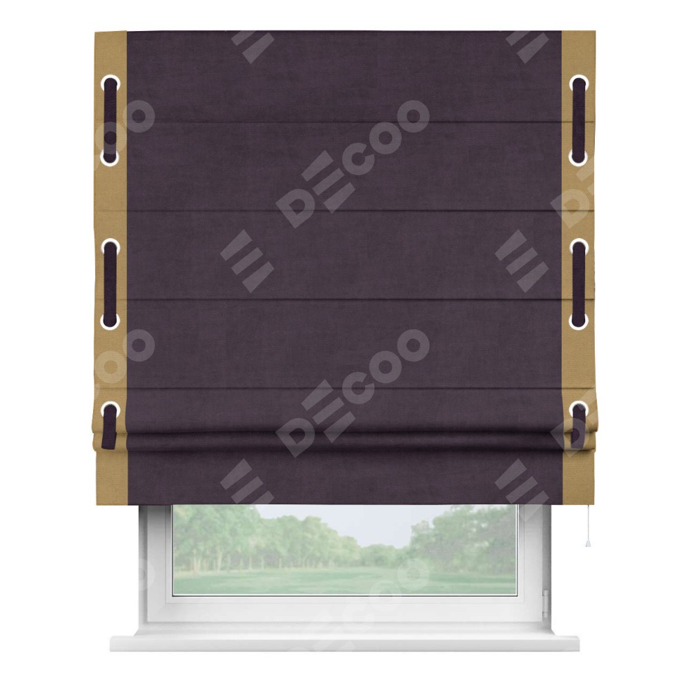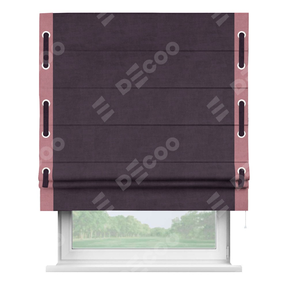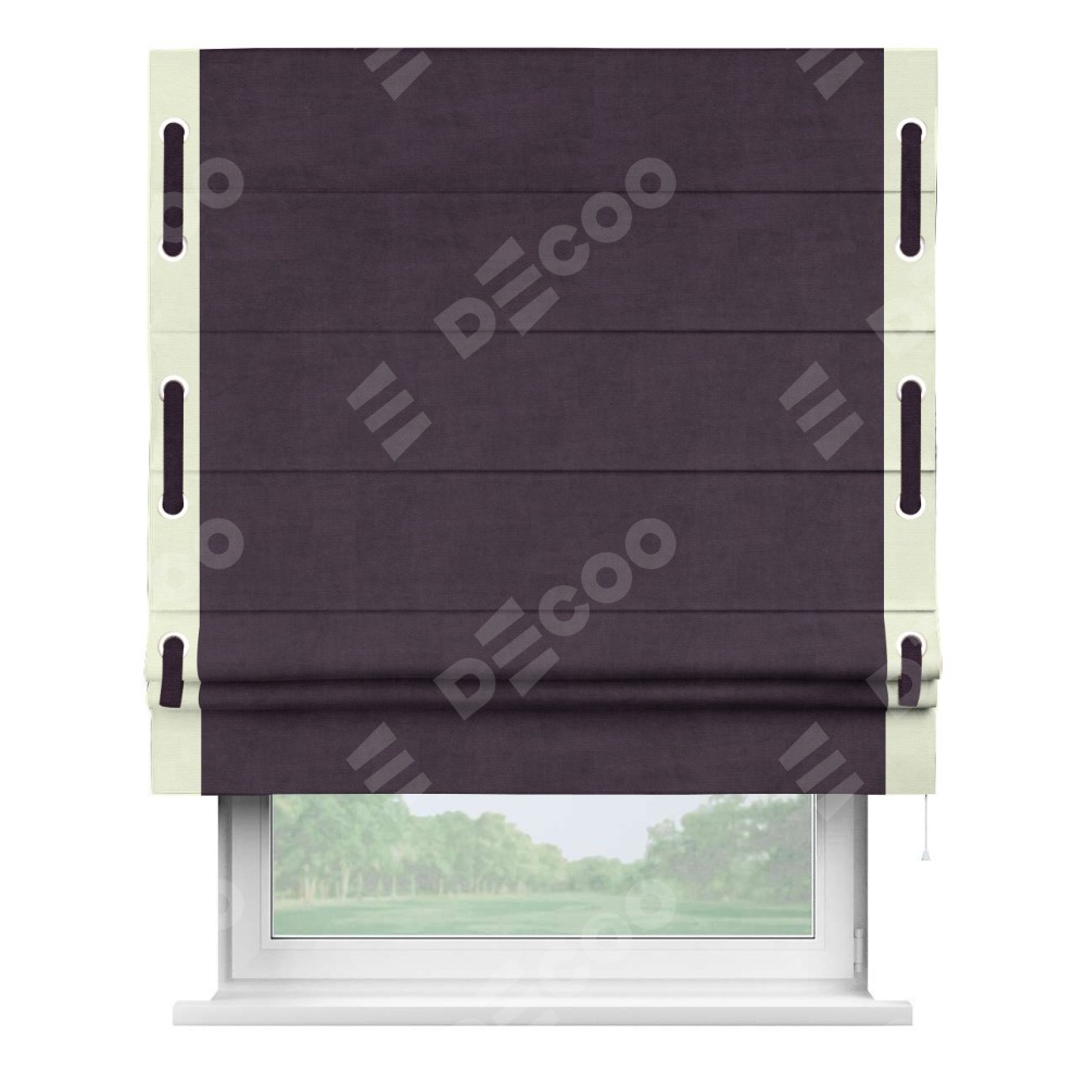 Римская штора «Кортин» для проема, вельвет тёмно-фиолетовый с кантом Стрим Дуо (люверсы с пояском)
