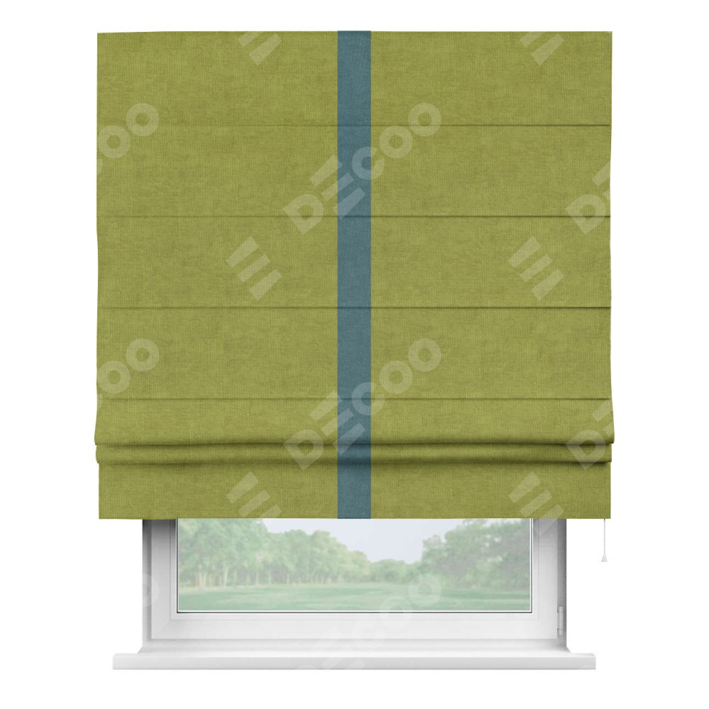 Римская штора производителя «Cortin», используется для проёма, пошита из ткани канвас зелёное яблоко, артикул ткани v-370. Отделка шторы кантом «Хайвей» (ментоловый v-114), ткань для канта используется из канваса разной расцветки на выбор. Имеет универсальный механизм и подходит для монтажа: на потолок, на стену и в нишу.