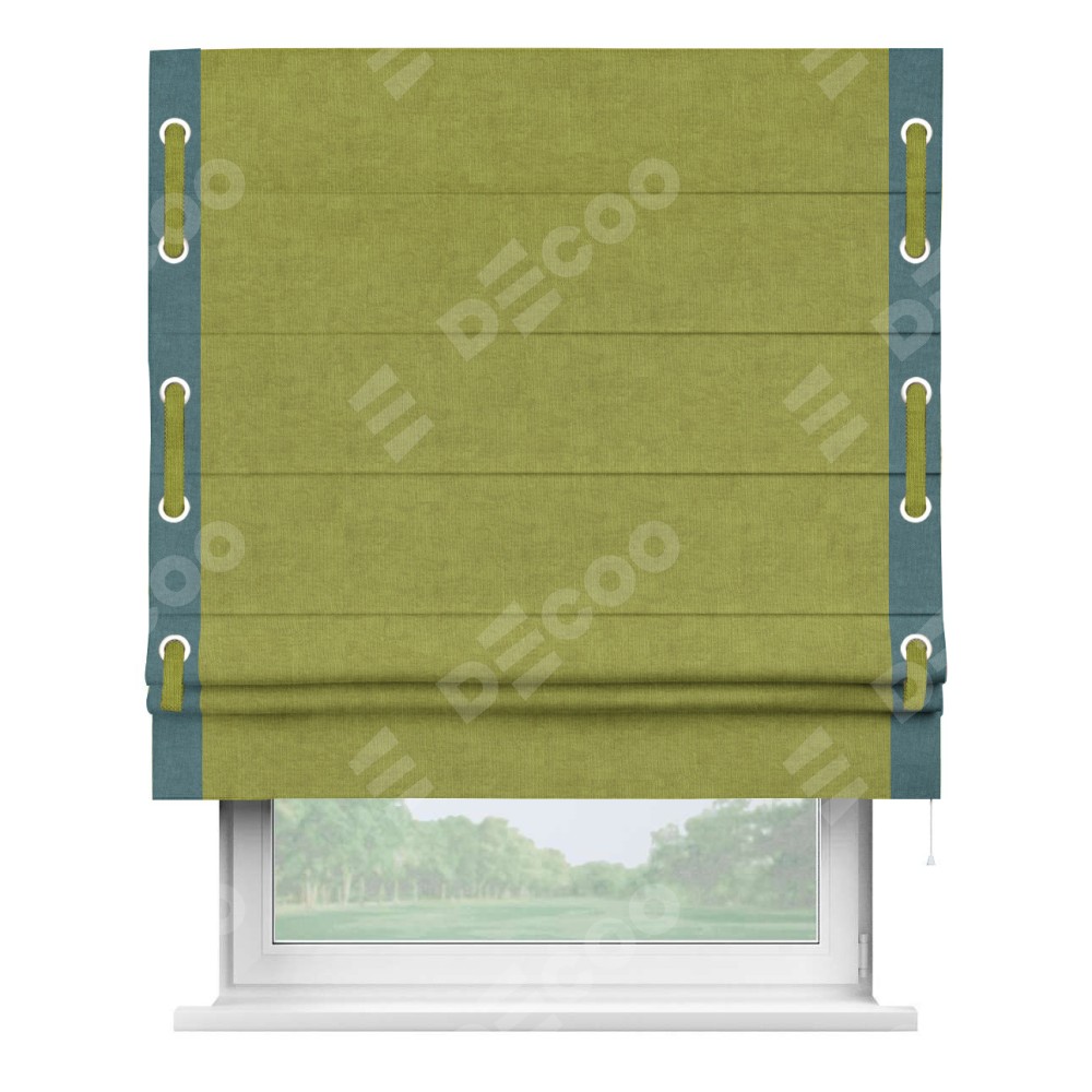 Римская штора производителя «Cortin», используется для проёма, пошита из ткани канвас зелёное яблоко, артикул ткани v-370. Отделка шторы кантом «Стрим Дуо» (ментоловый v-114) на кантах расположены люверсы с пояском, ткань для канта используется из канваса разной расцветки на выбор. Ткань для пояска обычно используется из основной ткани шторы, а так же можно сделать из любой расцветки по желанию. Имеет универсальный механизм и подходит для монтажа: на потолок, на стену и в нишу.
