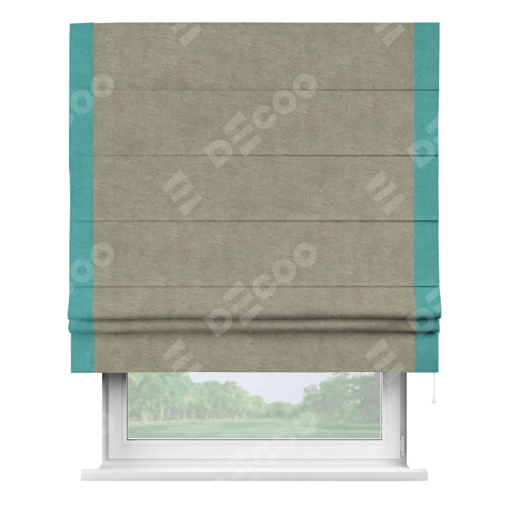 Римская штора производителя «Cortin», используется для проёма, пошита из ткани канвас капучино, артикул ткани v-211. Отделка шторы кантом «Стрим Дуо» (бирюзовый v-1048), ткань для канта используется из канваса разной расцветки на выбор. Имеет универсальный механизм и подходит для монтажа: на потолок, на стену и в нишу.
