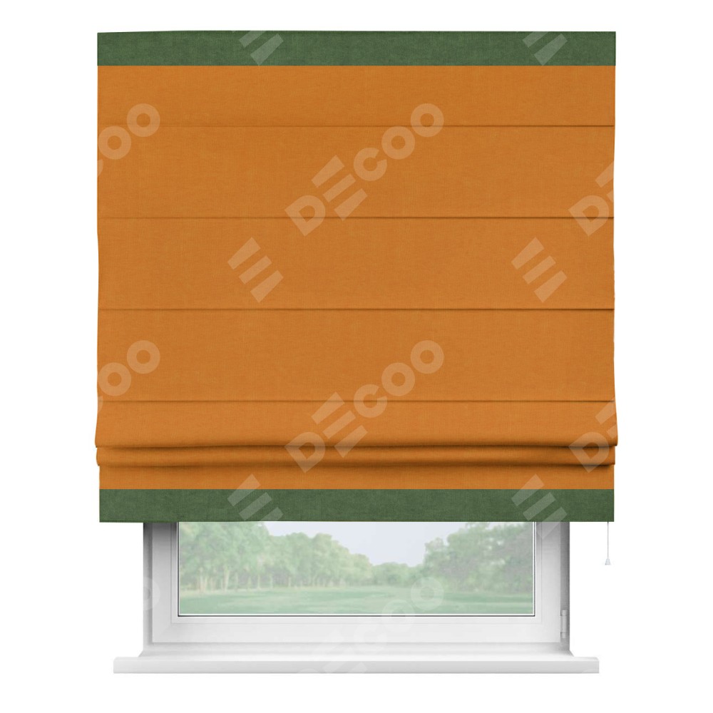 Римская штора производителя «Cortin», используется для проёма, пошита из ткани канвас оранжевый, артикул ткани v-106. Отделка шторы кантом «Горизонт» (зелёный v-16), ткань для канта используется из канваса разной расцветки на выбор. Имеет универсальный механизм и подходит для монтажа: на потолок, на стену и в нишу.