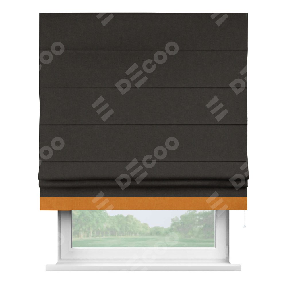 Римская штора производителя «Cortin», используется для проёма, пошита из ткани канвас тёмно-коричневый, артикул ткани v-13. Отделка шторы кантом «Джестер» (оранжевый v-106), ткань для канта используется из канваса разной расцветки на выбор. Имеет универсальный механизм и подходит для монтажа: на потолок, на стену и в нишу.